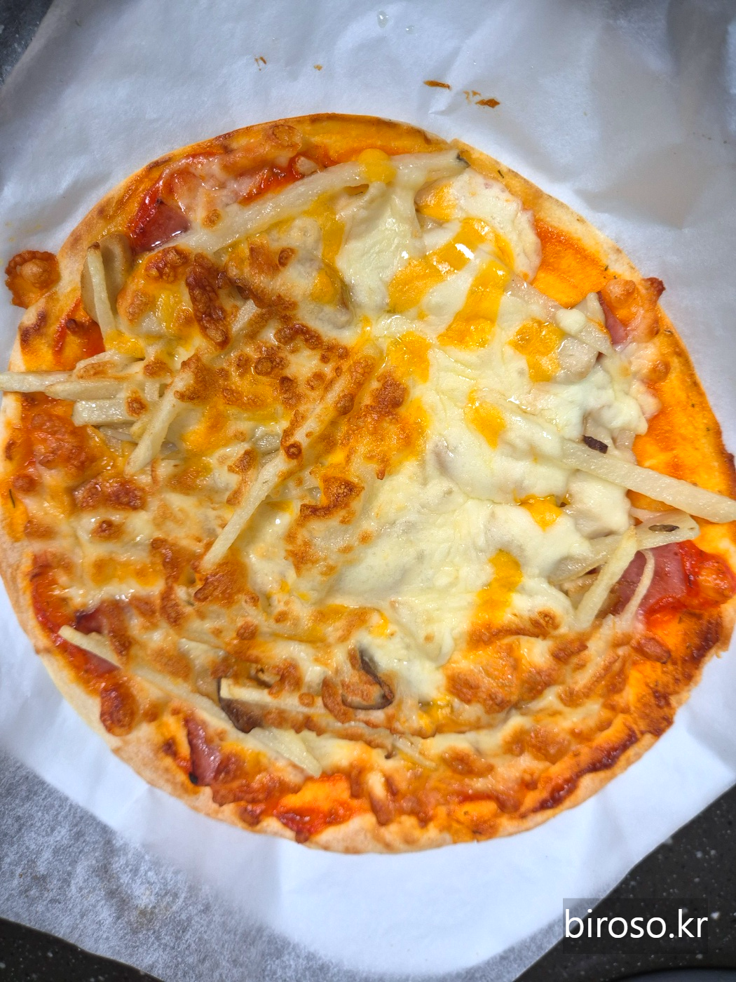 피자와 또띠아 가장자리가 적당히 구워진 느낌이 들면 더 먹음직 스럽다. 여기에 파슬리 가루같은 걸 뿌리거나 하면 좀 더 그럴듯한 비주얼이 된다.