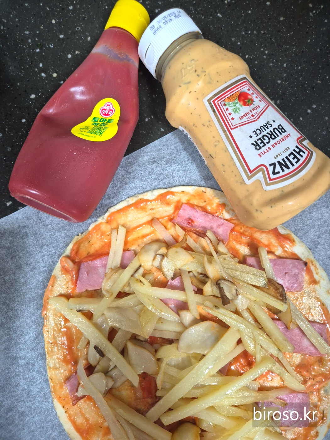 집에서 만들어 본다면 한 판에 3000원도 들어가지 않는다. 원하는 재료의 토핑을 마음껏 올릴 수 있으니 좀 더 넉넉하게 먹을 수 있다.