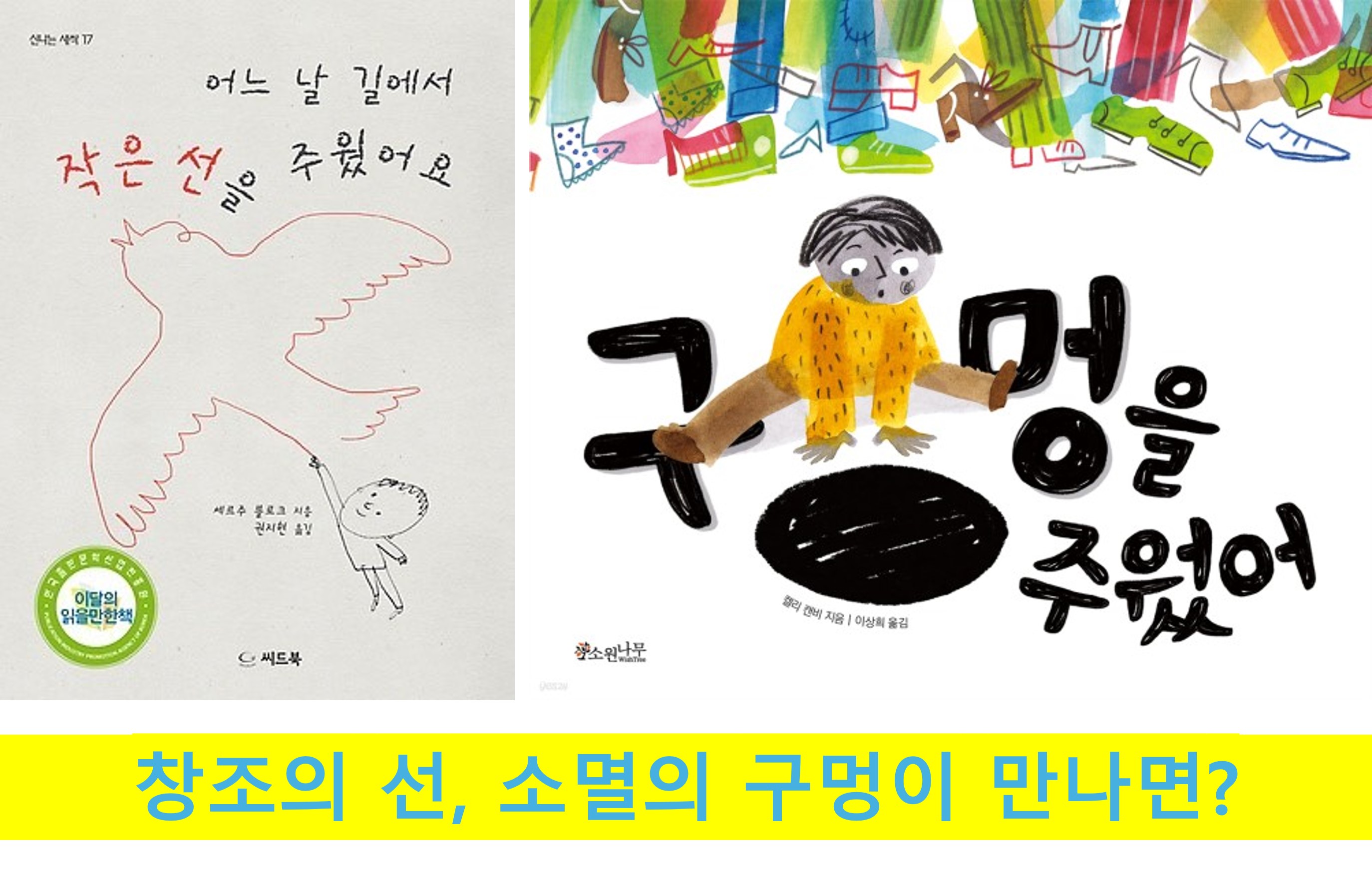 두 개의 책 중 하나는 <어느 날 길에서 작은 선을 주웠어요>이고, 다른 하나는 <구멍을 주웠어>이다.