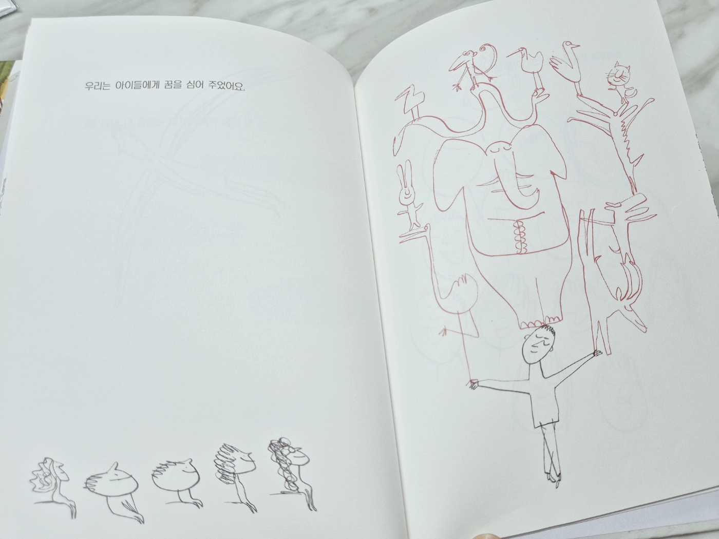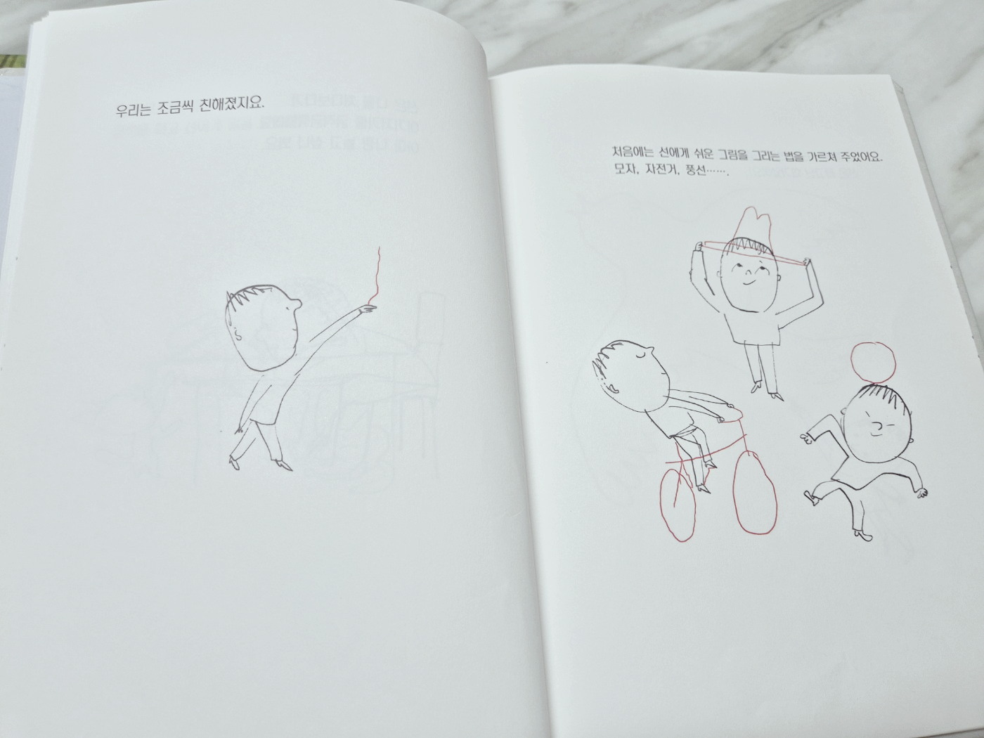 <어느 날 길에서 작은 선을 주웠어요>는 길에서 빨간 선을 주운 아이의 일생에 관한 이야기다. 유명 작가가 된 세르주 블로크의 그림 재능에 관한 자전적 이야기를 담았다고 한다. 나와 교감하는 무언가의 존재는 사람을 더 의미있게 만든다. 그런 존재로 빨간 선은 곧 나 자신이다. 질풍 노도의, 굴곡진 인생을 함께하며 나의 재능을 발휘할 수 있는 영감을 준다.
