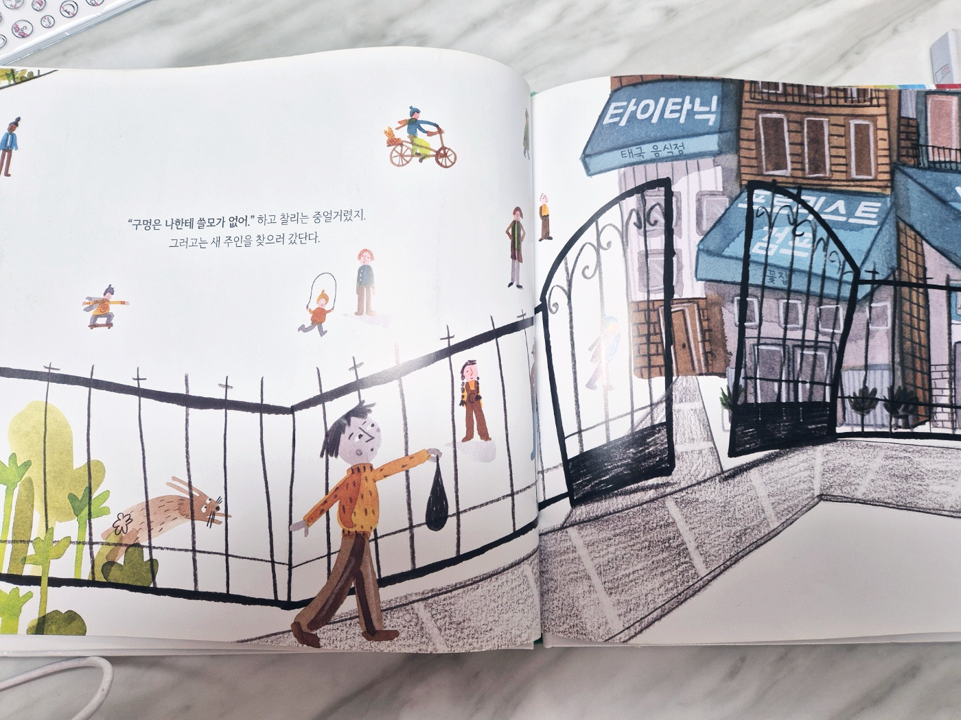 <어느 날 길에서 작은 선을 주웠어요>가 선을 중심으로 간략하게 그려진데다가 여백이 넓었던 것과 비교할 때 <구멍을 주웠어>의 그림은 수채화 느낌으로 채색이 되었고 펼친쪽 양면을 적절하게 활용하는 방식이다.