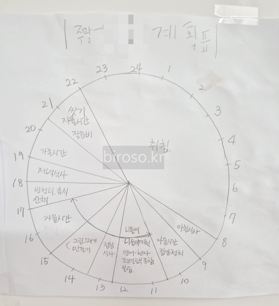 드디어(라고 쓰고 결국이라 읽는다.) 여름방학이 시작되었다. 우리 아이의 학교는 이번 여름방학이 3주 정도로 짧은 편이다. 지난 겨울방학의 시간표 활용이 어느정도 효과가 있어서 이번 여름방학에도 시간표를 만들었다. 아이와 함께 시계를 그리고 일어날 시간과 잘 시간을 정하고 학원, 스마트학습지 하는 시간 등 평소 루틴하게 해야 하는 일정을 넣고 나머지 방학에 보충하고자 하는 내용을 상의해서 작성하였다.