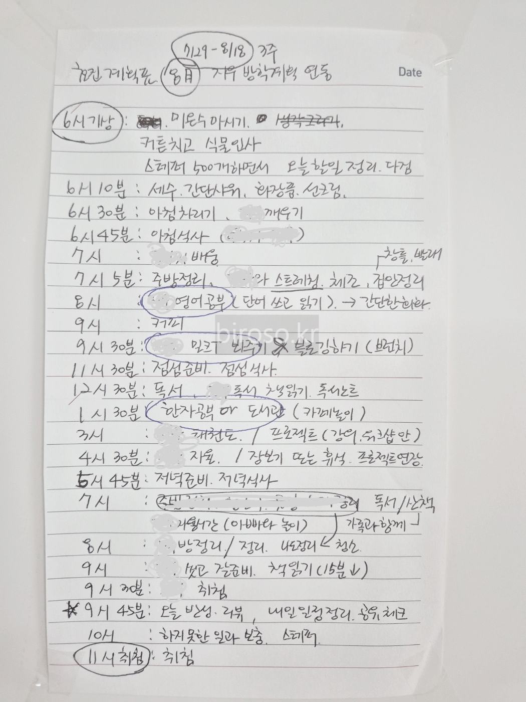 아침 일찍 출근하는 아빠 배웅을 위해 일찍 일어나는데 이번 방학에는 아침 식사도 함께 해보기로 했다. 아침밥을 많이 먹는 편이 아니라서 아이가 안먹게 되면 아침상은 따로 차려야 할 지도 모르지만 일단 합의는 했고 작성했다. 6시반 일어나려면 취침도 빨라야 해서 9시반에 잠들기로 했다.