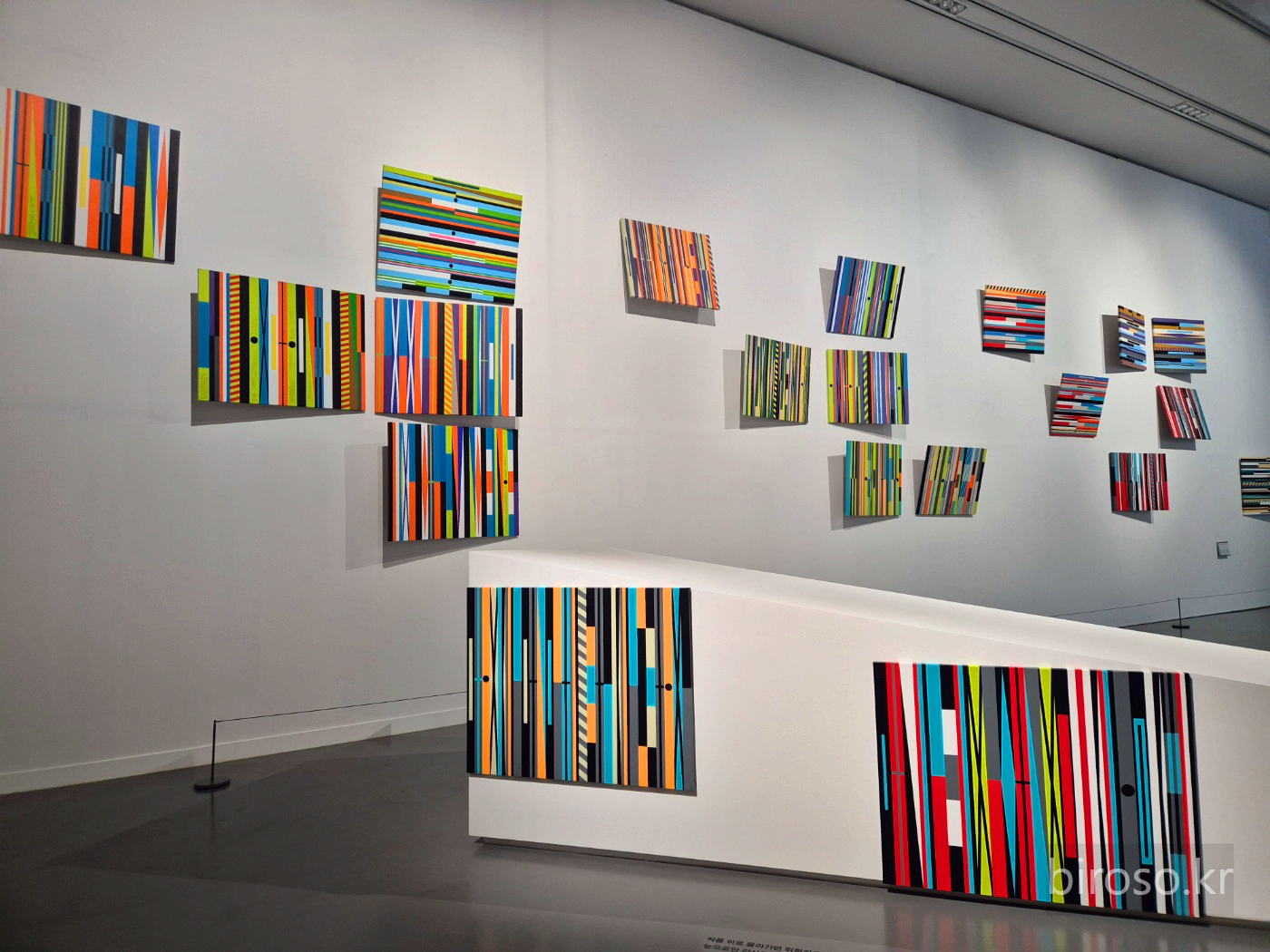 위쪽 벽면의 작품은 '제니 홀저의 11개의 경구들'이라는 작품이다. 제니홀저의 <경구들>에서 발췌한 문구를 이미지화한 것으로 국립현대미술관 과천관 돌다리에 새겨져있다고 한다. 이미지의 평면이 벽면에 붙어 있지 않고 서로 다른 방향을 가지고 설치 된 것이 인상적이었다.