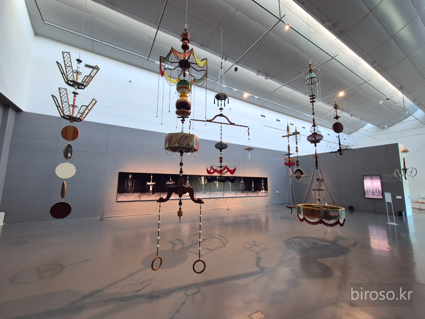 아이는 노트를 꺼내들고 작가 소개에 그려진 작품을 드러낸 이미지를 따라 그렸다. 복고풍의 공간에 걸려있을 것 같은 샹들리에, 드림캐쳐 혹은 주술적인 의미가 담긴 어떤 기계장치같은 설치물은 층층이 구슬이나 원판, 가느다란 줄과 와이어로 운율을 만들어 내는 것 같다가도 슬쩍 슬쩍 흔들리는 와중에 새로운 표정을 지어 보이는 듯 하다.
