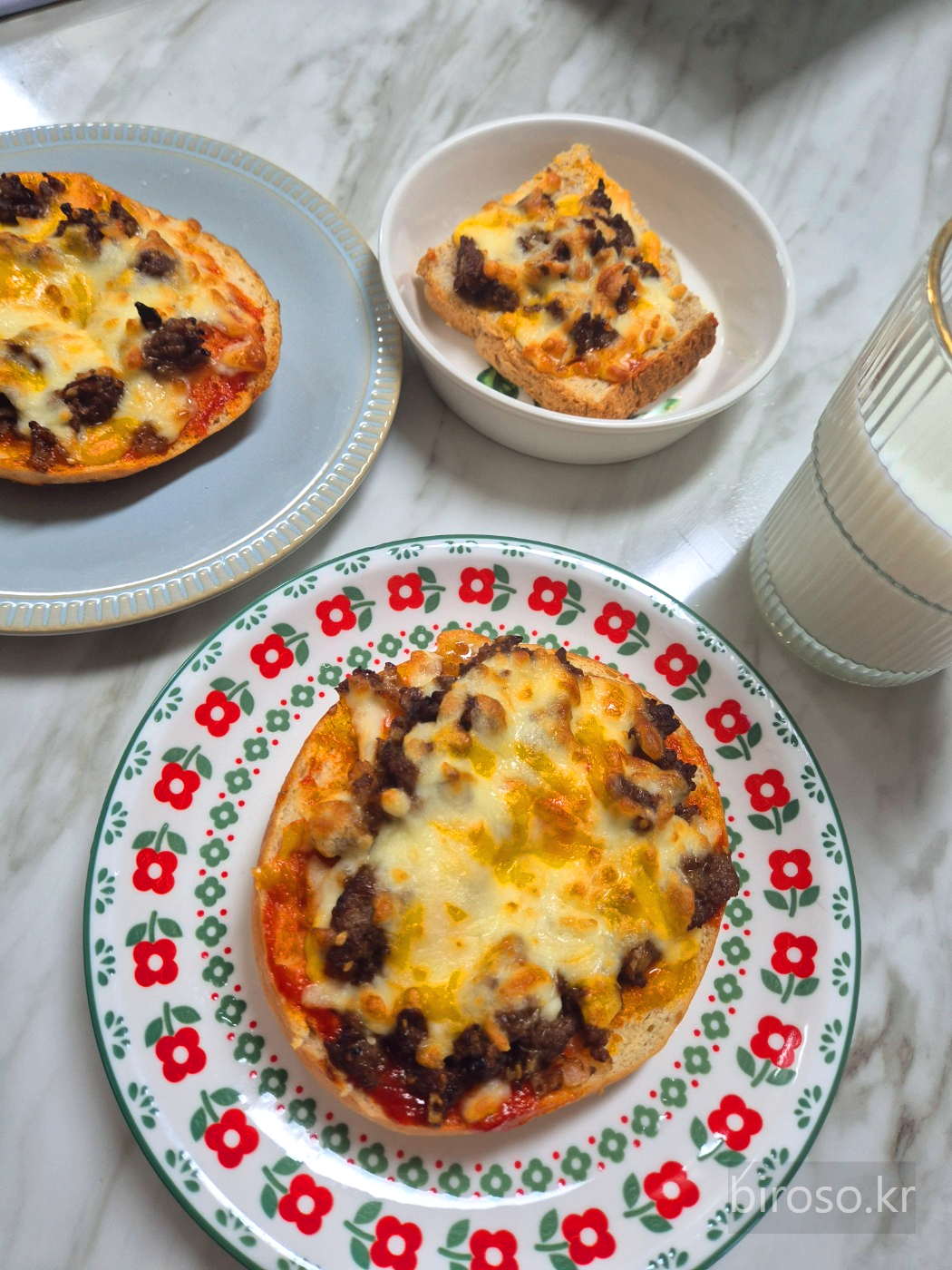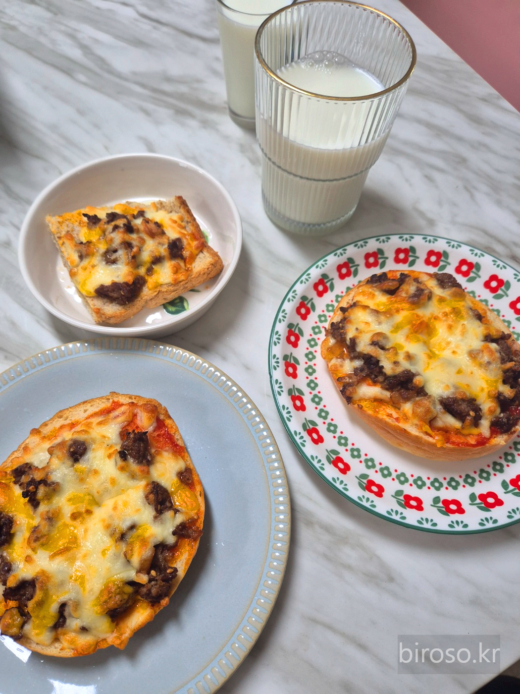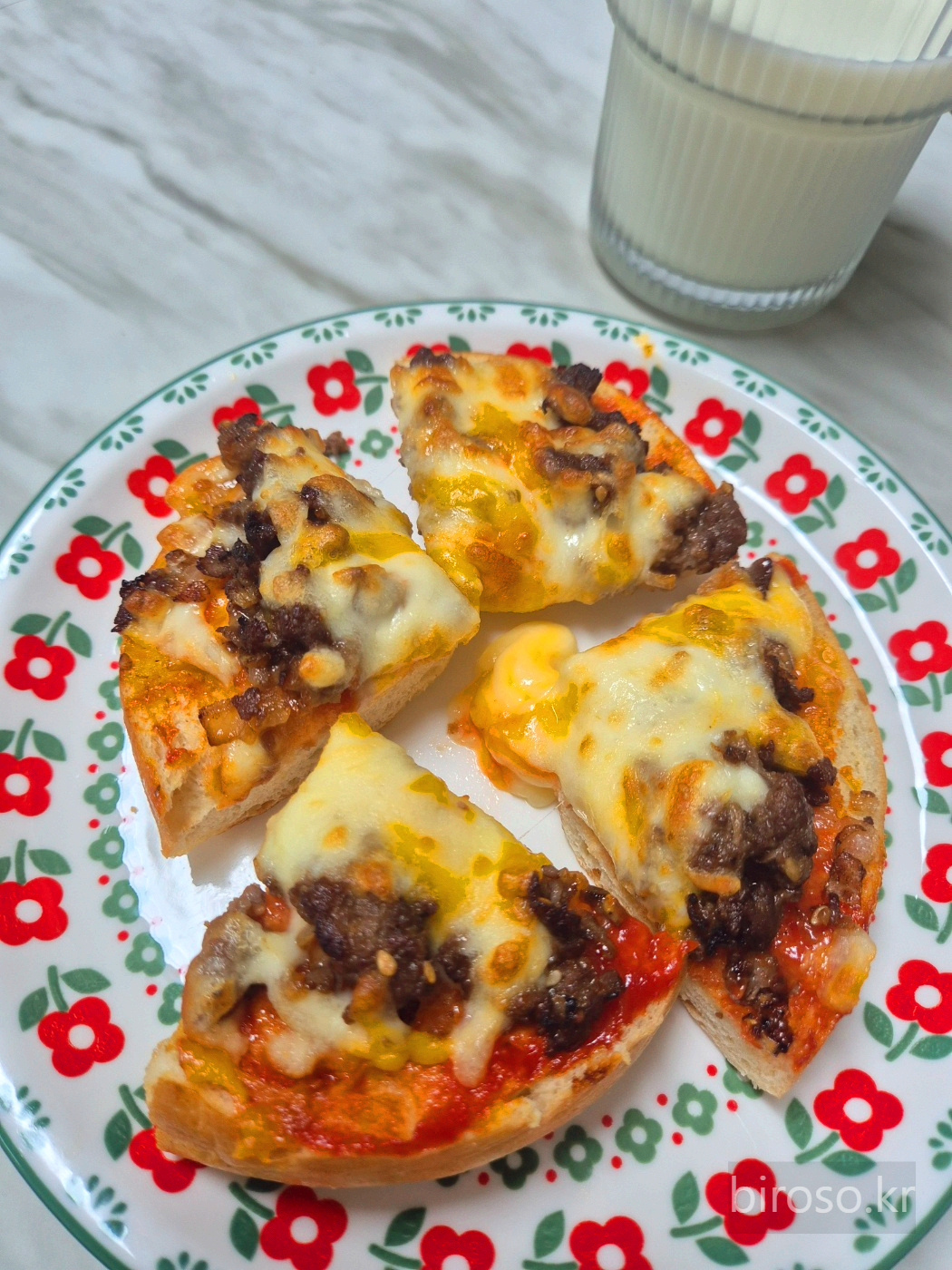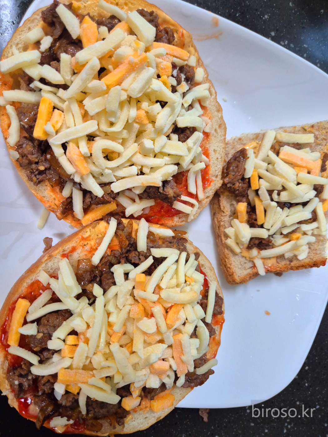 남편은 이런 것도 집에서 만들어 먹을 수 있느냐고 반가워했다. 재료만 있으면 만드는 것은 정말 간단하다. 도우를 만드는 것도 아니고 소불고기도 이미 양념된 것이 있으니 가능한 것이다. 양파 베이글이 피자빵 도우로 궁합이 정말 좋다.