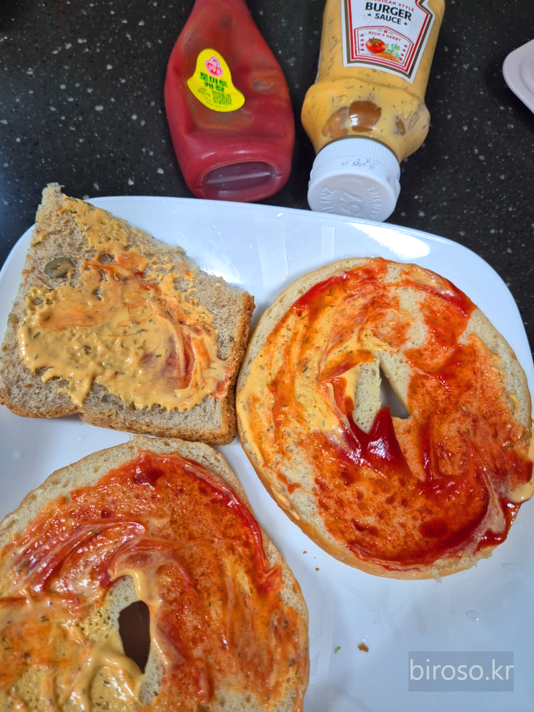 3. 베이글 안쪽에 케쳡과 버거 소스를 바른다.
