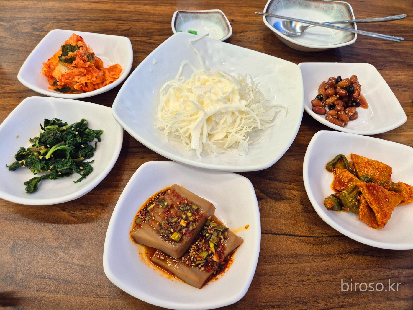 기본 반찬으로 샐러드, 오뎅볶음, 콩조림, 김치, 나물, 도토리묵이 나왔다.