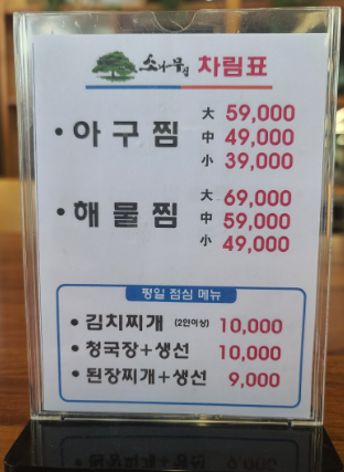 소나무집 아구찜은 소자 39000원이고 해물찜은 소자 49000원이다. 그 외에도 황태구이, 영양굴밥, 영양돌솥밥, 제육볶음, 바지락칼국수, 대구탕, 해물파전, 낙지볶음, 왕새우튀김, 어린이돈까스가 있다. 점심메뉴로 김치찌개, 청국장, 생선이 있는데 주변 주민들에게도 인기가 많은것 같았다. 생선이 함께 나오는 것이 매력인 듯하다.