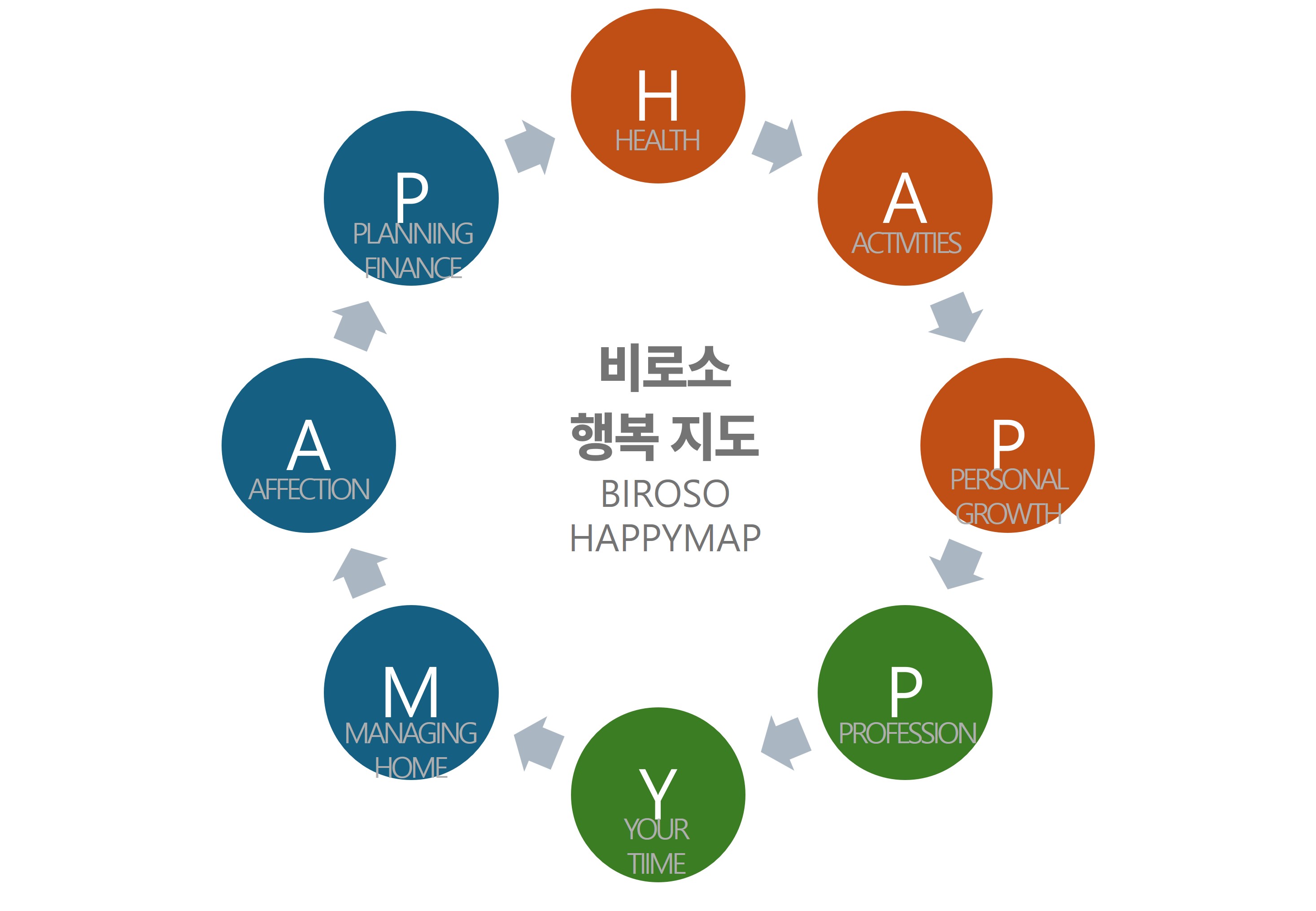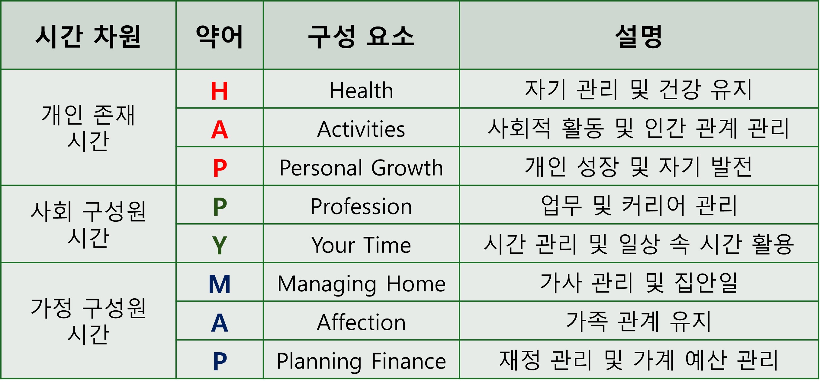 워킹맘에게는 사적 존재로서 개인, 가정 구성원, 사회 구성원으로서의 세가지 차원의 시간이 필요합니다. 그 시간 속에서 삶을 구성하는 8가지 요소를 채워나갑니다. 그 시간을 구성하는 요소들은 건강, 인간관계, 자기발전, 커리어관리, 시간관리, 가족관계, 재정관리입니다.