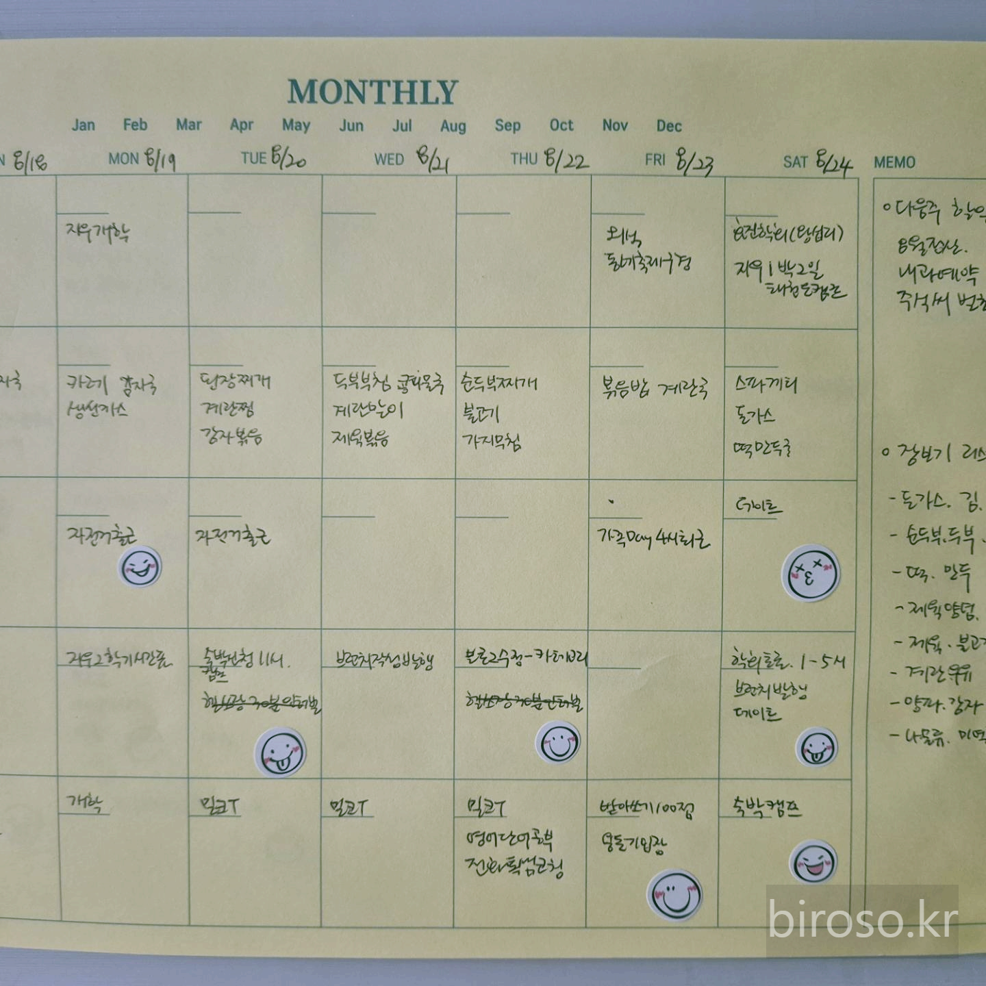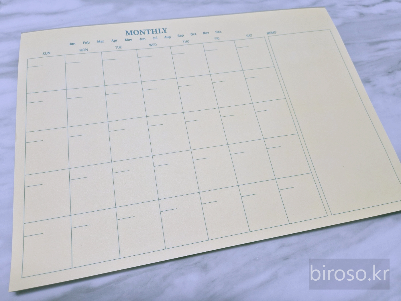1월-12월 체크하고 일요일-토요일로 칸이 나눠져 있어서 달력처럼 7일 1주일이 5줄로 나누어져 있어 날짜를 적어서 사용할 수 있게 되어있다. 오른편에는 메모를 할 수 있게 되어 있다.