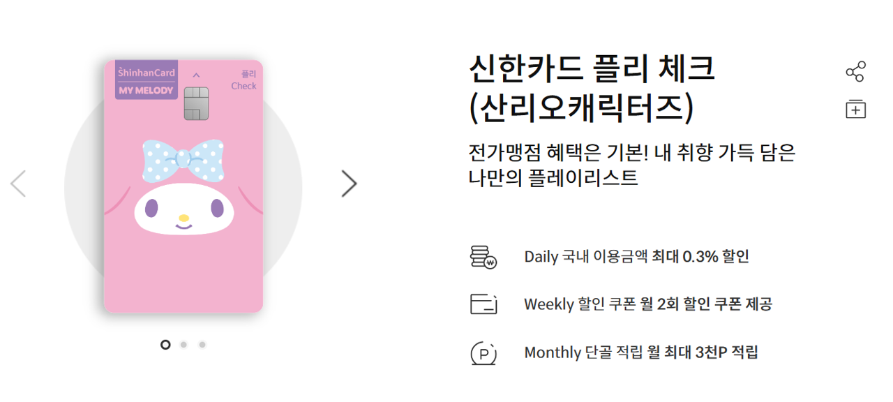 아이 용돈카드는 아빠이름의 별도 통장에서 빠져나가도록 만들어두었다. 카드가 아이가 좋아하는 캐릭터인 산리오 쿠로미가 그려진 것을 골랐다. 아이가 무척 좋아하였다. 신한은행체크카드 플리체크 산리오캐릭터즈다. 신한카드 플리 체크(산리오캐릭터즈) < 체크카드 < 신한카드 (shinhancard.com)