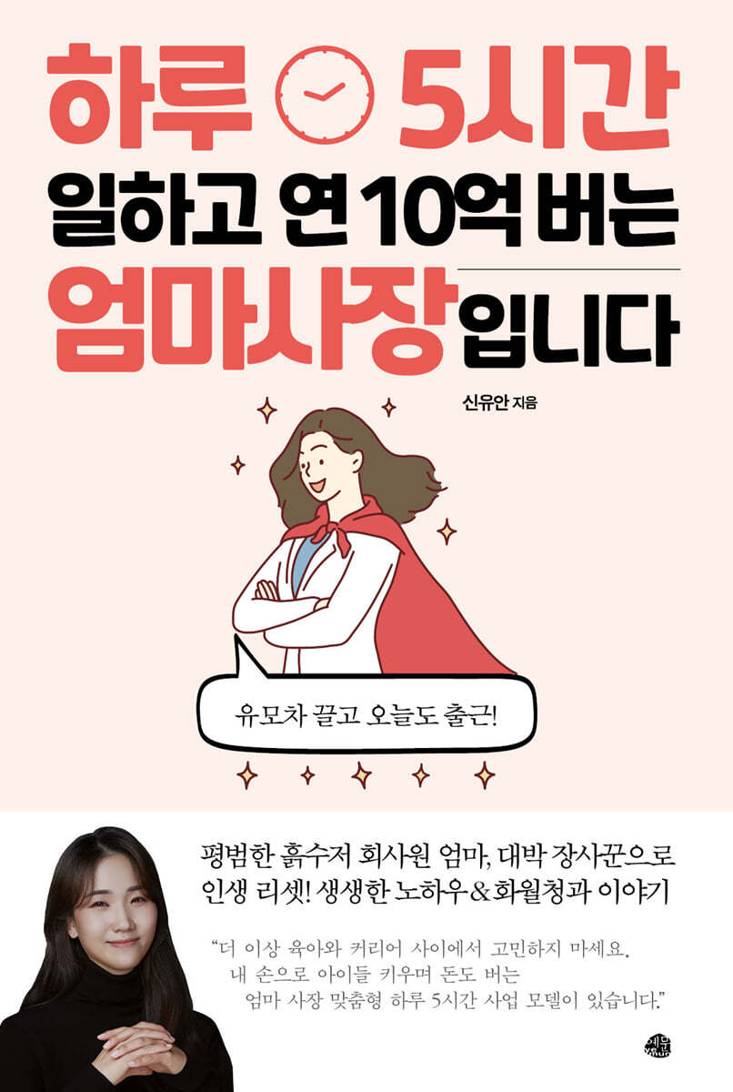 그런 가운데 <하루 5시간 일하고 연10억 버는 엄마사장입니다>의 저자 신유안은 어떻게 한정된 시간을 일하면서 큰 성공을 거둘 수 있었는지가 궁금하다. 은행 정규직으로 안정적인 수입이 보장된 엄마는 휴직기간동안 아이를 최선을 다해 보살피기 위한 결단을 한다. 바로 아이 보육, 양육의 공백이 생기지 않도록 최소한 허락된 5시간만 집중적으로 일을 하겠다는 결심이다. 그 5시간은 회사를 다닌다면 쓰게 되는 부가적인 비용 즉, 교통비 등의 개인 지출비용과 아이를 맡기는데 들이는 비용을 제외한 최소 금액인 100-150만원 정도라도 벌 수 있으면 된다는 기준을 잡았다.
