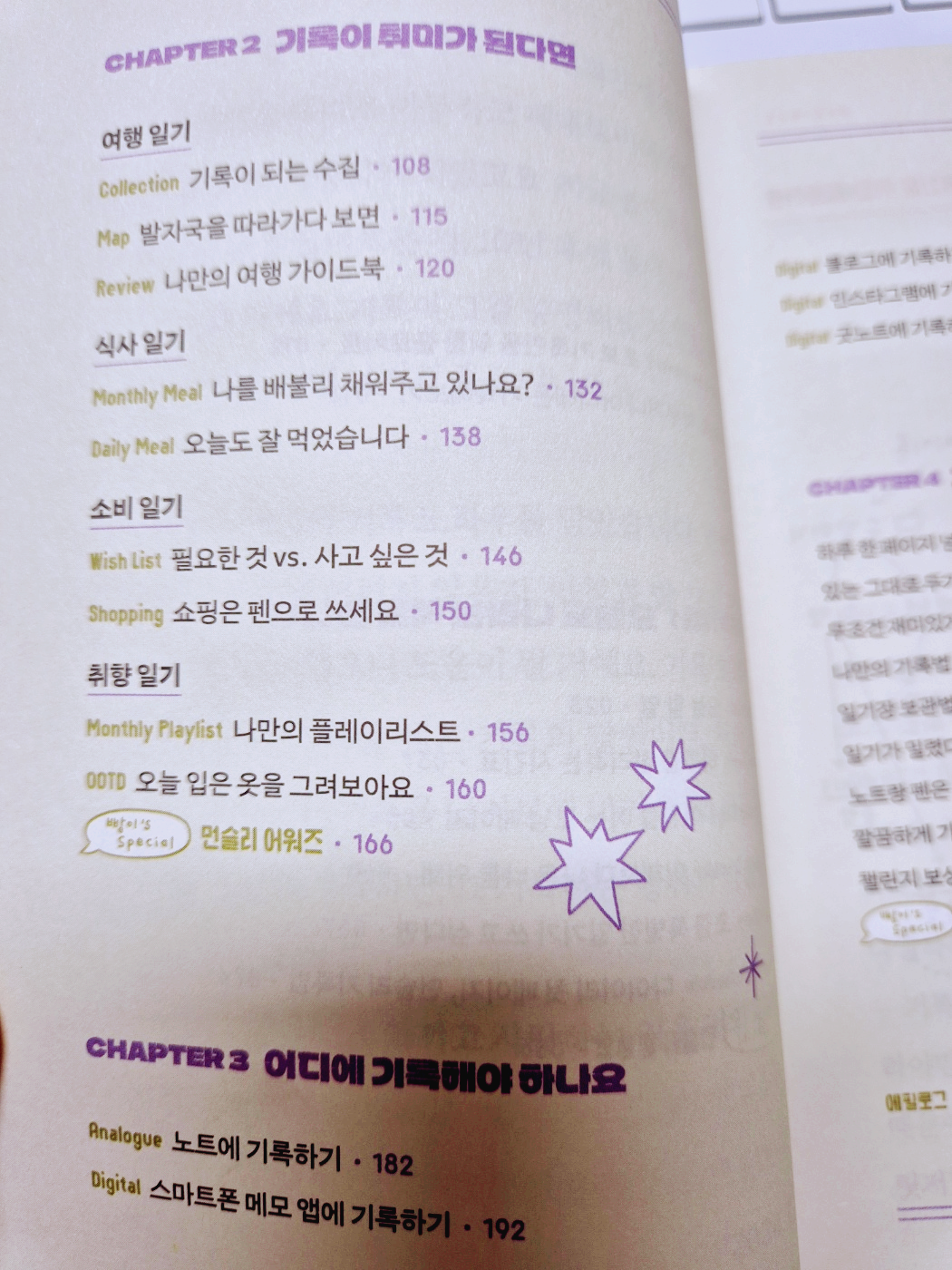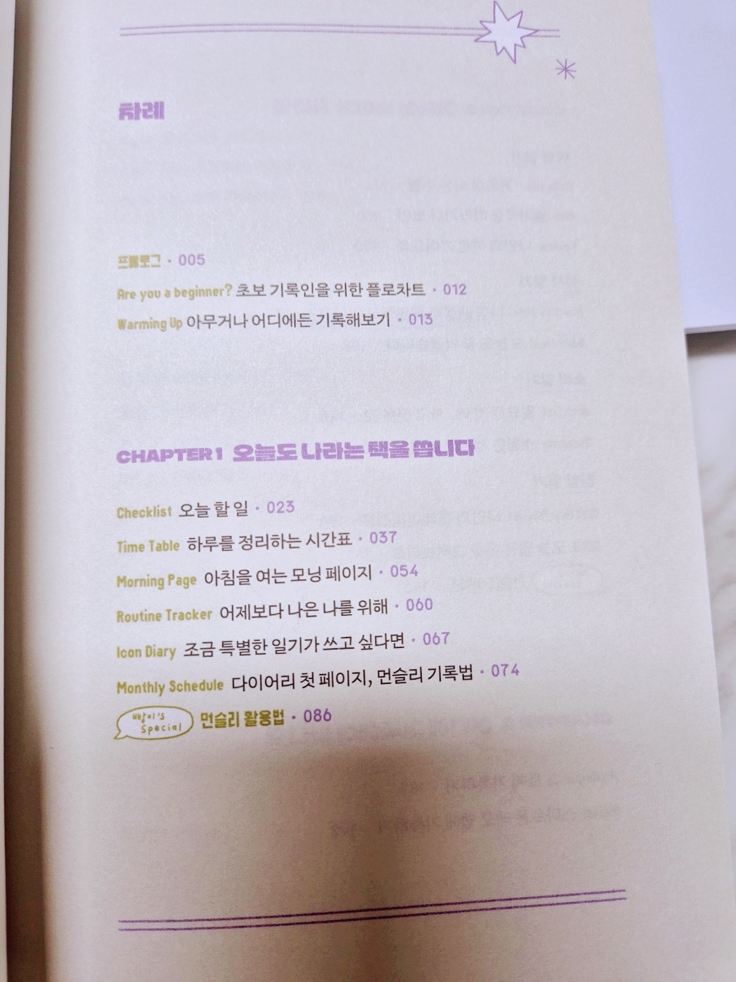 목차는 기록의 종류, 활용, 방법, 도구로 구성되어 있다. 일단 다이어리를 꾸준히 쓰지 않은 사람들이라면 어디에 무엇을 기록해야 하는지 어리둥절하다. 특히 워킹맘의 경우는 개인, 가족, 회사에 관한 여러 층위가 뒤섞이는 경우가 많다. 기존 다이어리의 포맷을 나에게 맞춰 변화를 주려고 하는 것도 그래서다.