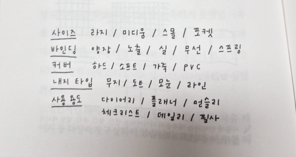 아날로그 다이어리를 고르기 위해 고려해야 할 것들은 사이즈, 바인딩방법, 커버방식, 내지 타입과 사용용도다.