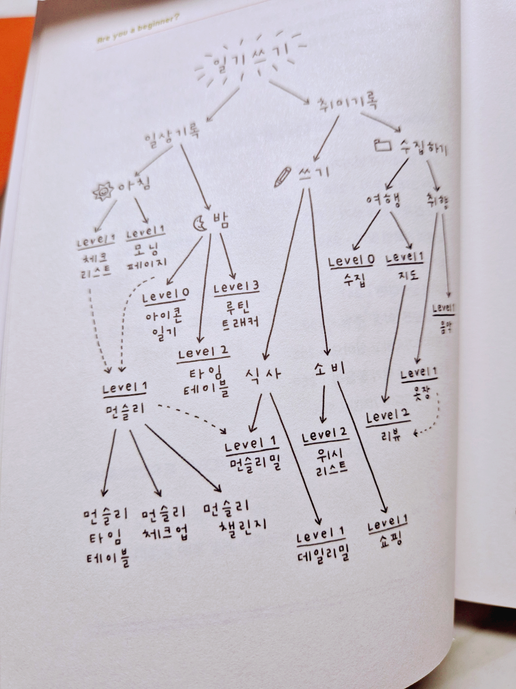 하루의 기록을 일기라고 한다면 일기에는 다양한 기록이 있다. 저자가 분류해 놓은 것이 도움이 많이 되었다. 이 중에서 나의 하루를 보다 보람있게 만들 수 있는 것을 생각하고 실천해보면 좋겠다는 생각이 들었다. 일상과 취미기록으로 나누고 일상은 아침과 저녁의 계획과 반성으로 나눌 수 있을 것이다. 또한 방식은 루틴/습관을 잘 수행했는가를 모아보는 루틴트래커, 기록을 좀 더 단순하게 만들어주는 아이콘 활용 등으로 아이디어를 제안하고 있다.