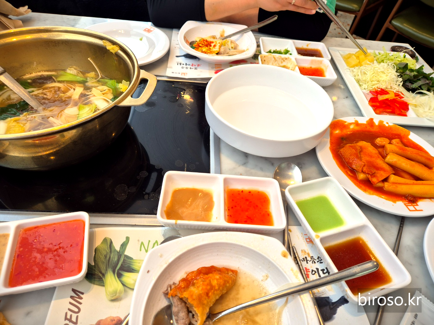 샤브샤브에 넣을 야채와 어묵 등을 담을 수 있는 코너와 볶음 우동, 떡볶이, 튀김 등을 담을 수 있는 코너가 있다.