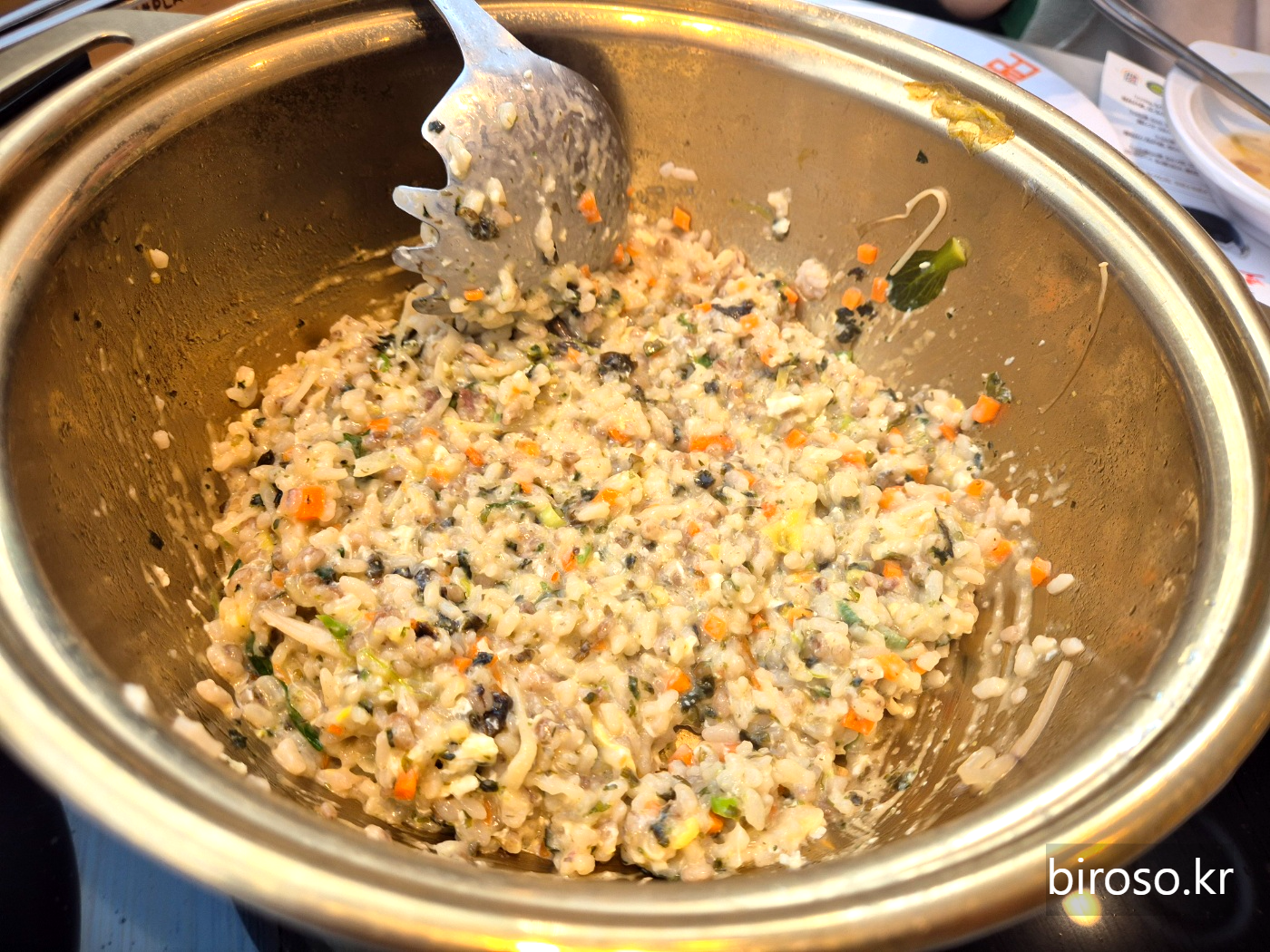 마지막으로 죽을 만들어 먹었다. 국물을 조금 덜어내고 여기에 밥과 야채, 참기름, 김가루와 계란을 넣고 끓여주면 한국인 후식인 죽이 완성된다.