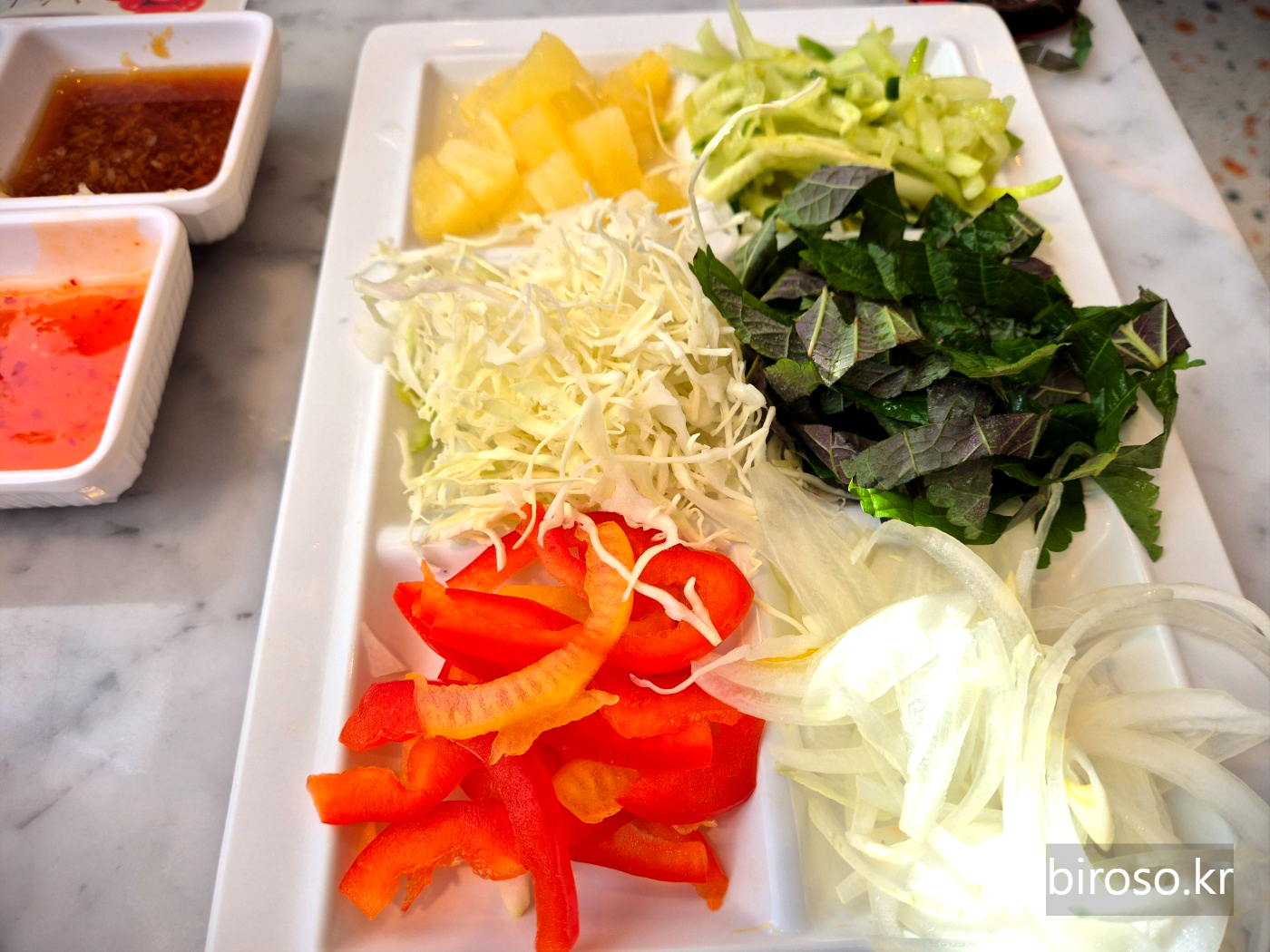 또 월남쌈에 들어갈 야채와 라이스페이퍼, 뜨거운 물을 담을 수 있는 식기와 정수기도 마련되어 있다.