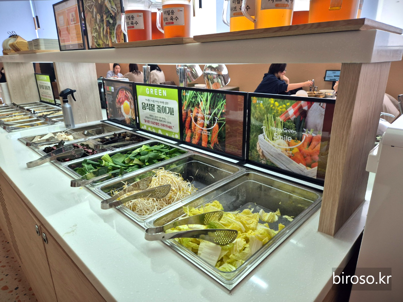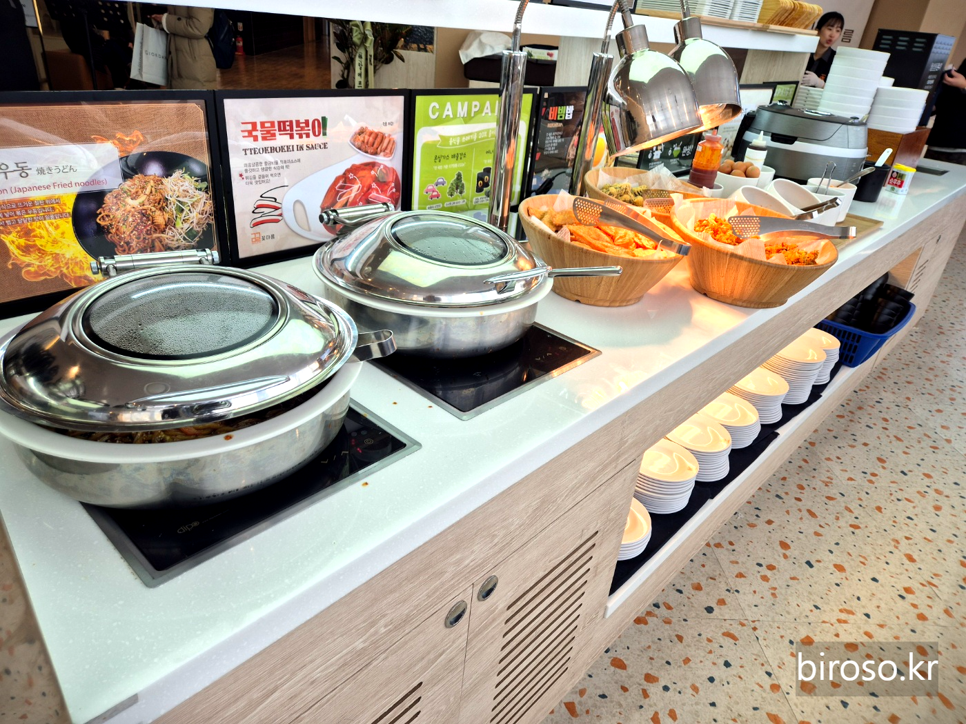샤브샤브에 넣을 야채와 어묵 등을 담을 수 있는 코너와 볶음 우동, 떡볶이, 튀김 등을 담을 수 있는 코너가 있다.