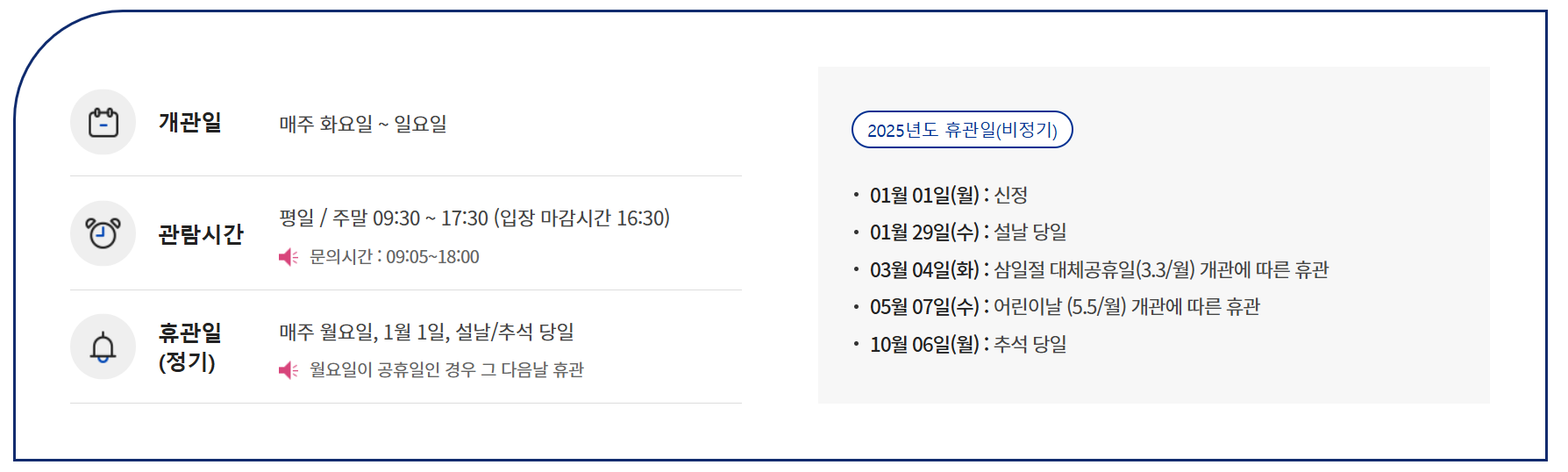 매주 월요일은 휴관, 관람시간(9시30분-17시30분)과 2025년 휴관일(신정, 설날당일, 3/4, 5/7, 추석당일) 확인