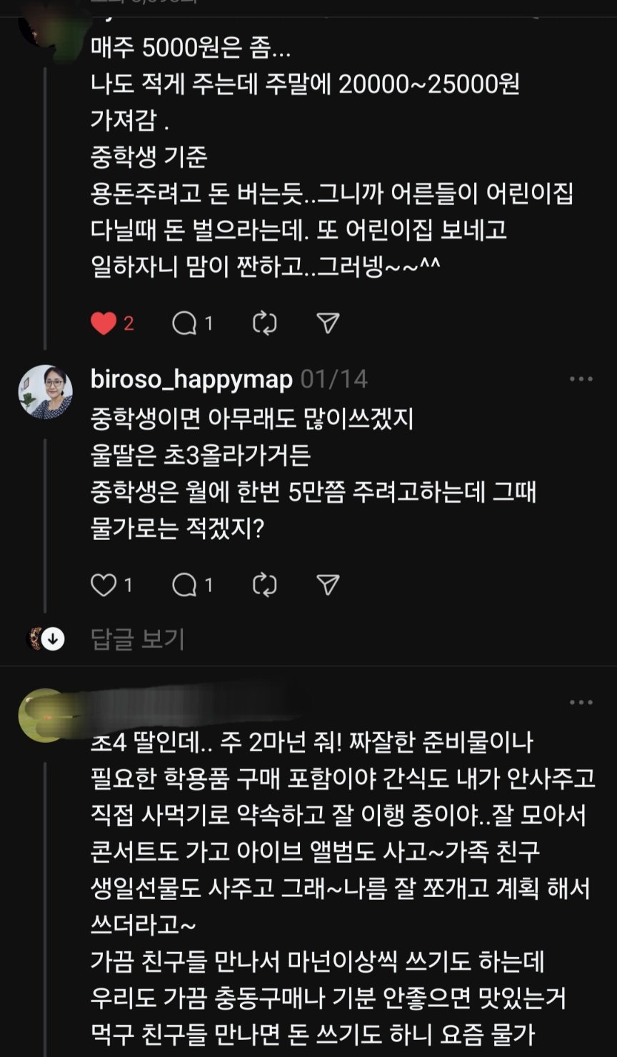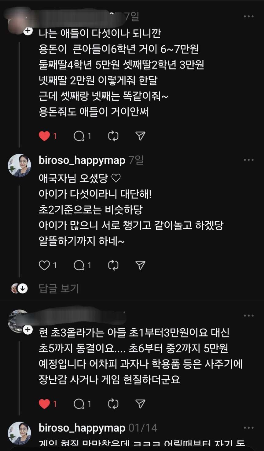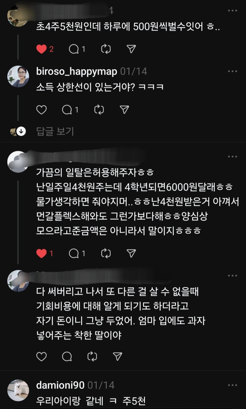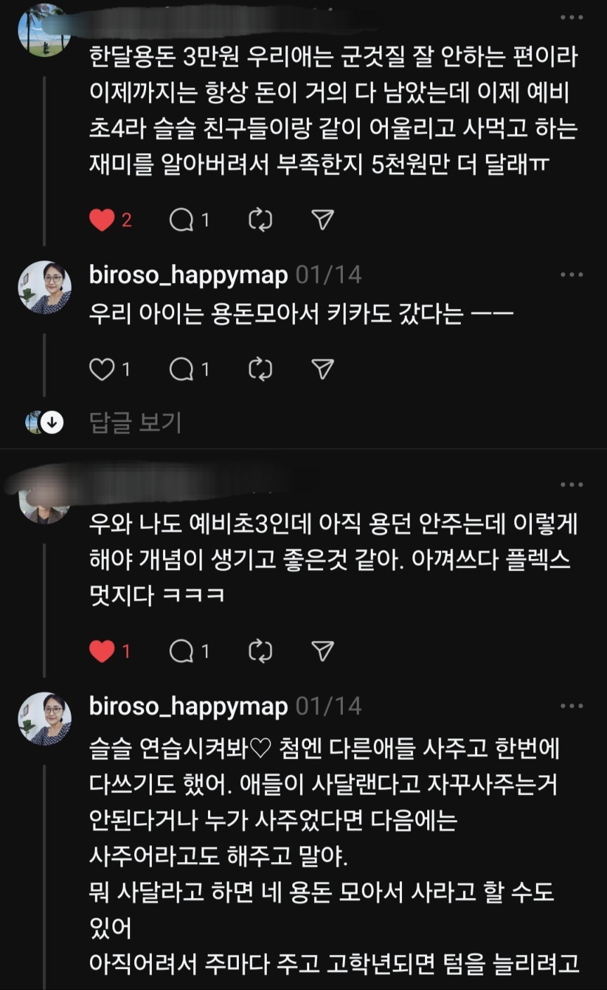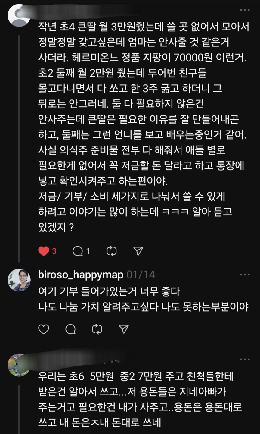 스레드에 친구들에게 용돈을 어떻게 주고 있는지 물었더니 다양한 답변이 나왔다. 용돈을 주지 않은 친구들도 있었지만, 그들도 용돈을 직접 관리하는 것이 필요하다고 생각한다는 댓글을 달았다.