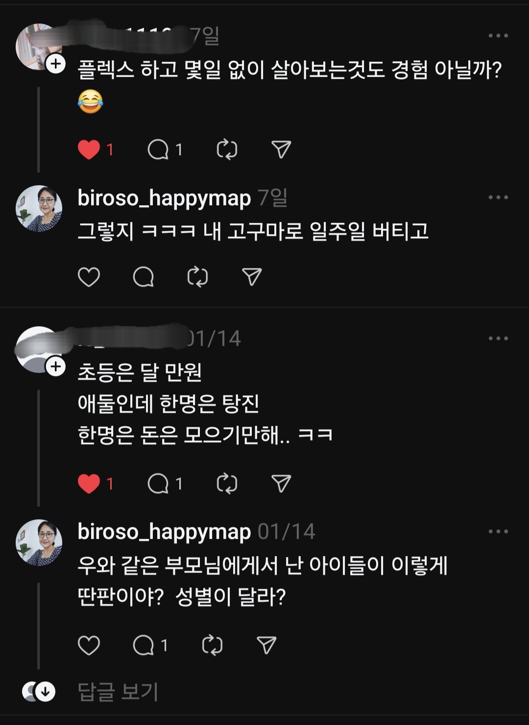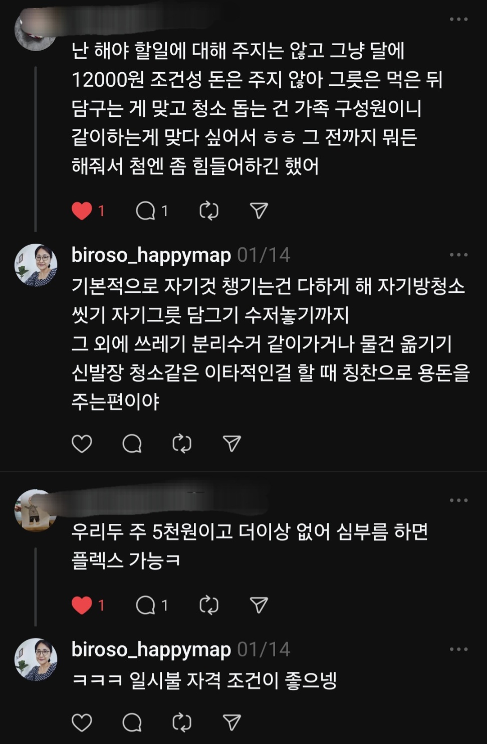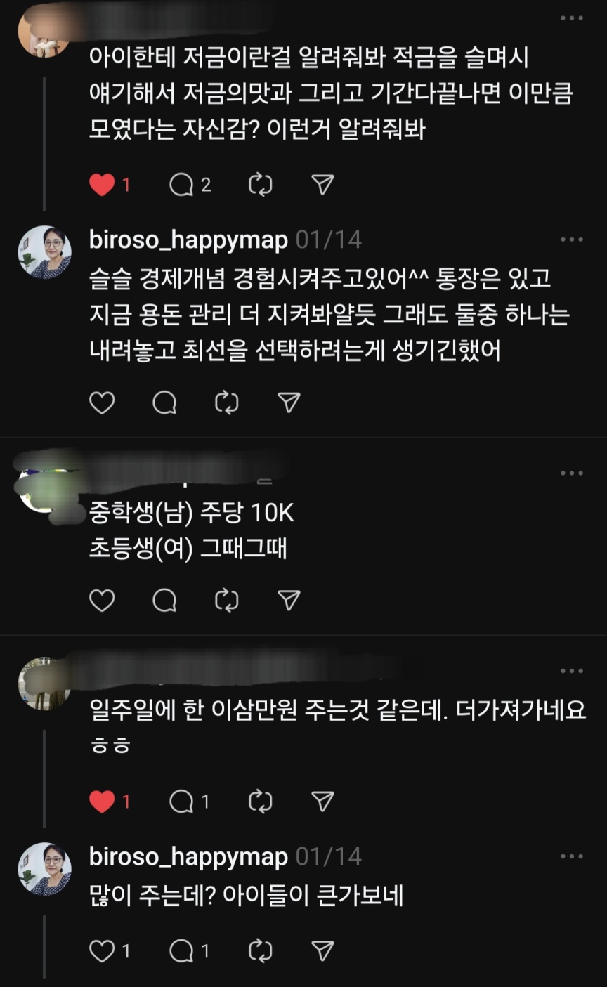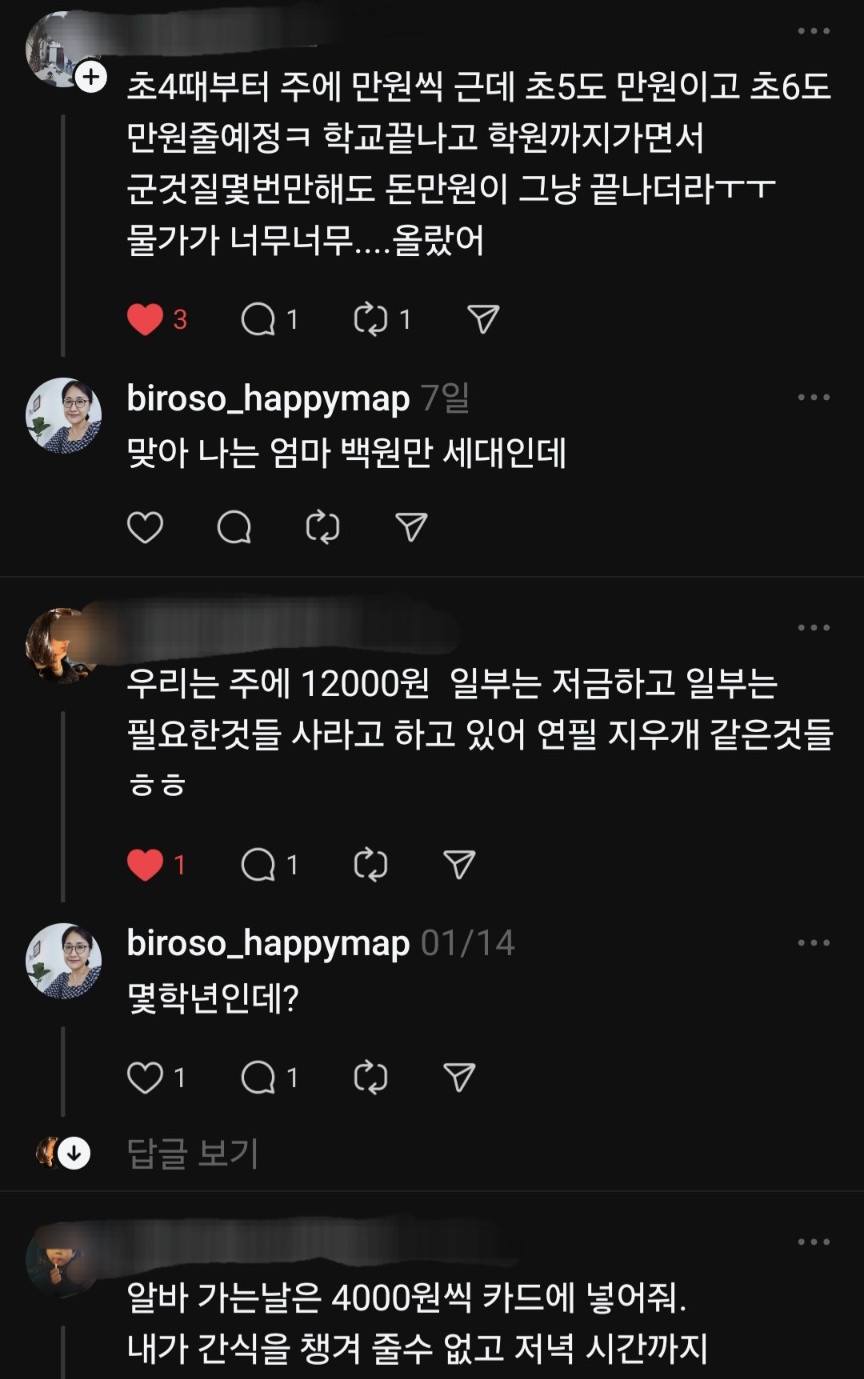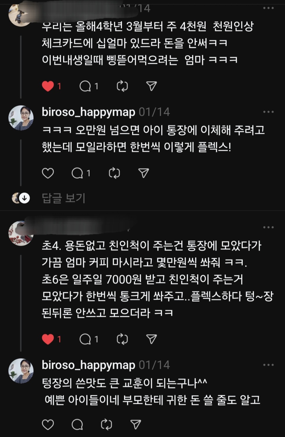 스레드에 친구들에게 용돈을 어떻게 주고 있는지 물었더니 다양한 답변이 나왔다. 용돈을 주지 않은 친구들도 있었지만, 그들도 용돈을 직접 관리하는 것이 필요하다고 생각한다는 댓글을 달았다.