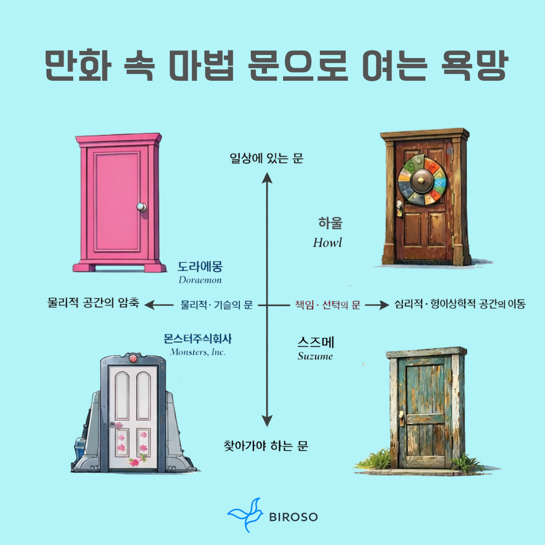이 네 개의 문을 하나의 좌표 위에 놓아보면 흥미로운 분기점을 발견한다. 도라에몽과 몬스터주식회사의 문은 물리적 공간의 압축이라는 기술적 상상 위에 충실하게 놓여 있다. 반면, 스즈메와 하울의 문은 심리적·형이상학적 공간으로의 이동, 그리고 책임과 선택의 서사까지 품고 있다. 문이 멀어질수록 그 문은 더 많은 의미와 부담을 요구한다.
