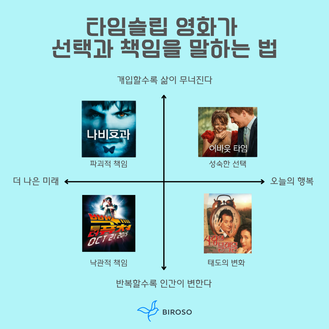 이번에는 네 편의 타임슬립 영화를 하나의 좌표 위에 놓고 비교해 보려 한다. 시간을 어떻게 사용했는가가 아니라, 시간 앞에서 무엇을 선택했고 그 선택이 어떤 책임으로 이어졌는가를 기준으로 삼아보려 한다.