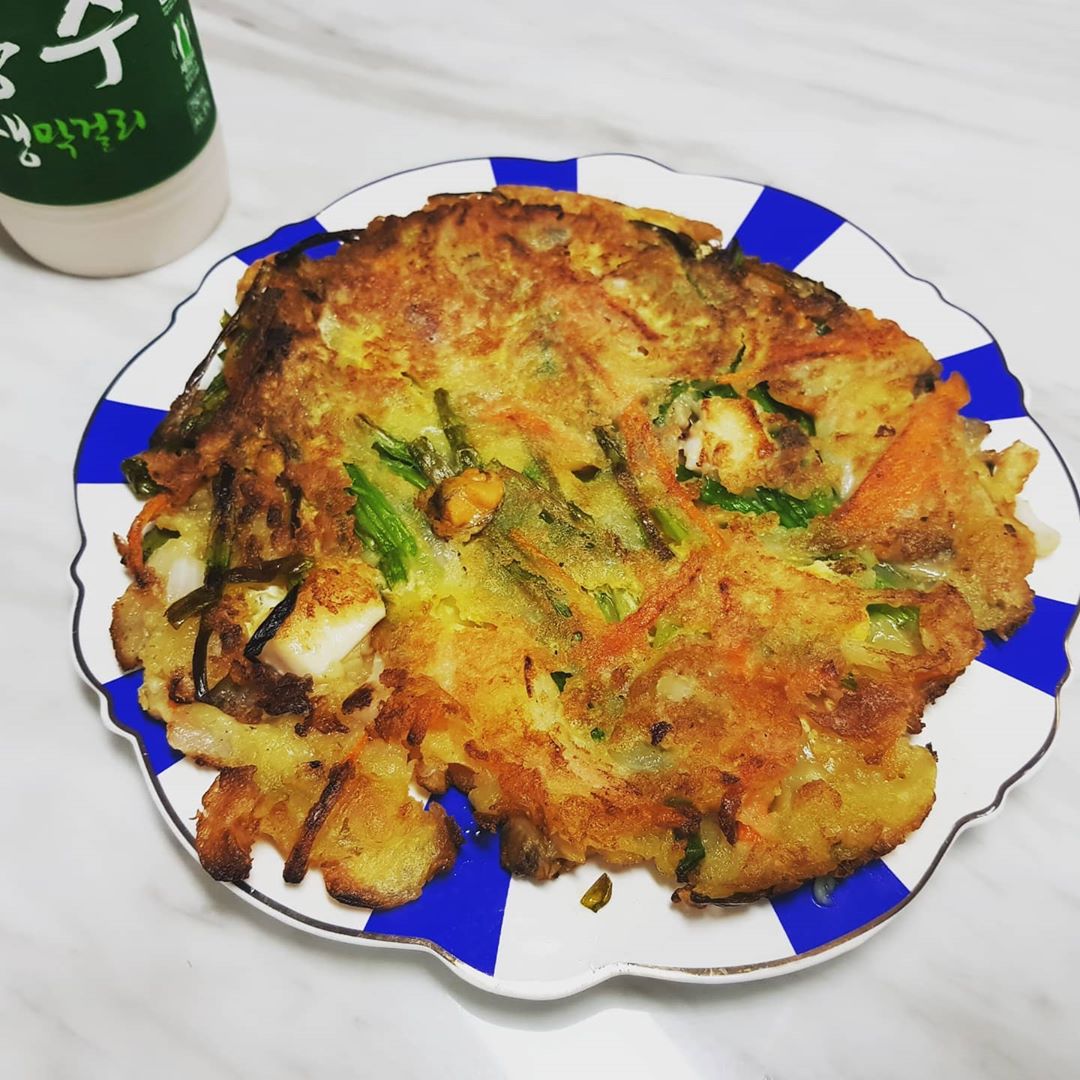 위 반죽만 만들어 두었다가 숙성되면 좀 쫄깃한 식감이 만들어지고, 반죽따로 후라이팬에 올렸다가 쪽파 위에 깔고 해물 얹어서 반죽 반국자 위에 올려주고 불조절하면 파는 파전처럼 만들어 먹을 수 있어요. 계란 노른자 풀어서 위에 토핑하면 색도 예쁘답니다.