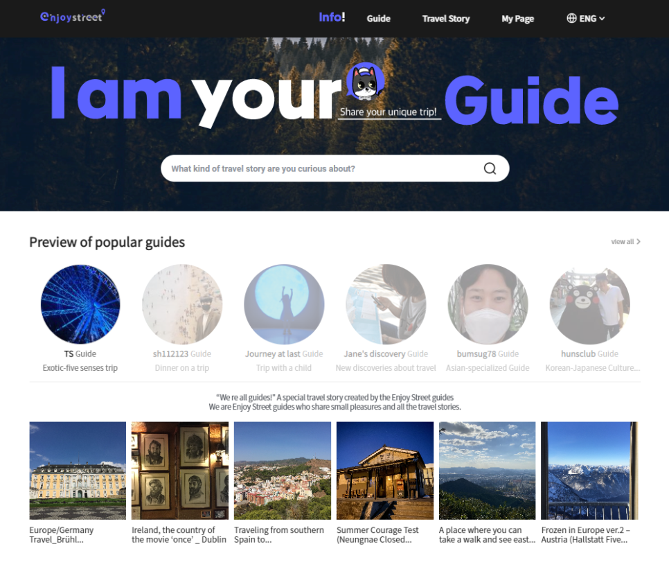 If you visit our EnjoyStreet website, you can find content in Korean. If you select the thumbnails of the representative guides, you can see the travel stories written by each guide. You can see that Jane is trying to tell a unique story, such as the travel sensibility of finding a special space such as Jane's discovery, the first trip, and TS, introducing a special destination with a child, and a tour focused on taste.