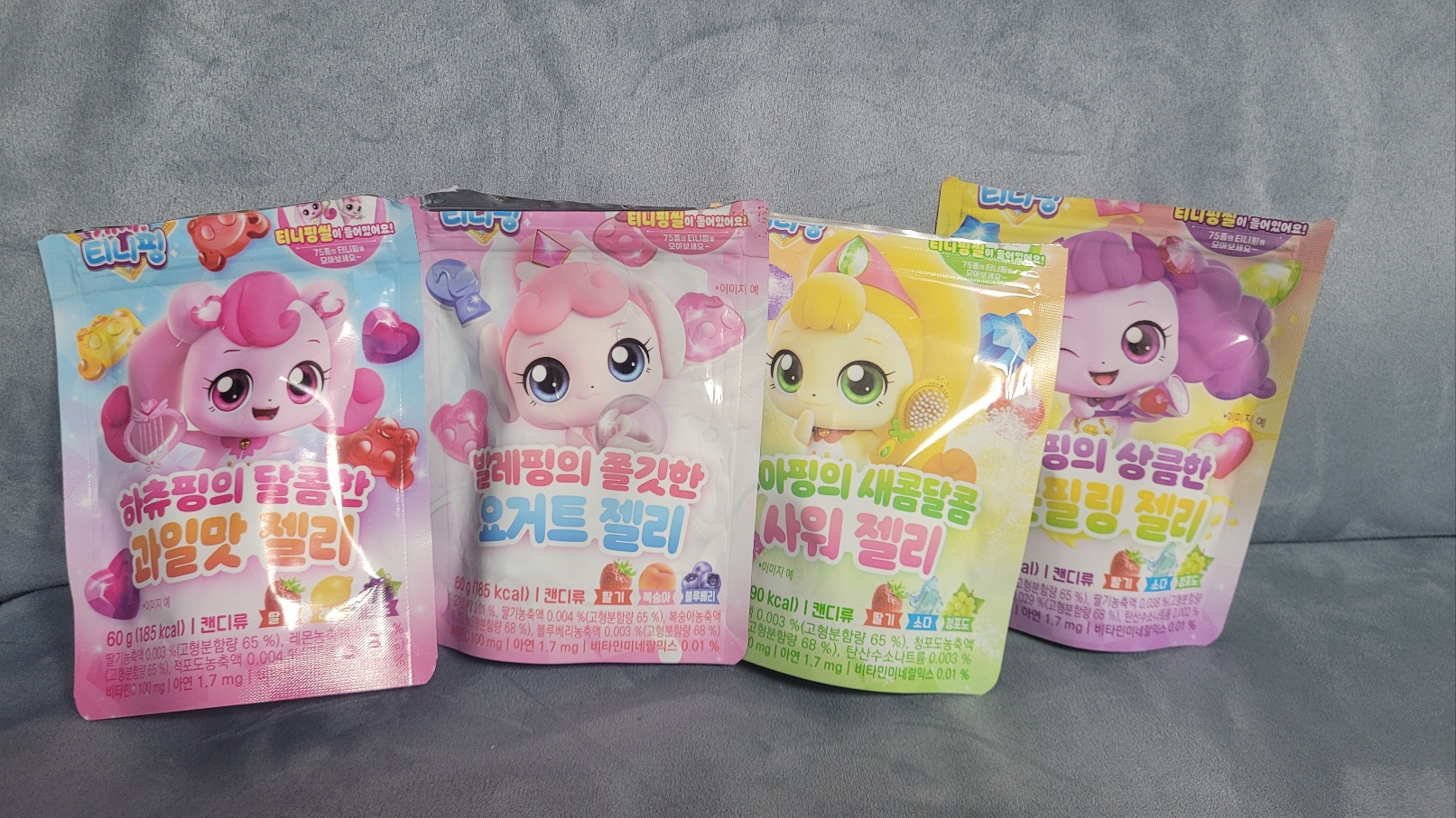 캐치티니핑 4종 젤리 패키지 모습인데 포장 뜯기 전 사진은 온데간데 없어졌다. 캐릭터는 하츄핑, 발레핑, 조아핑, 방글핑으로 4개 캐릭터로 되어 있고 각각 과일, 요거트, 사워, 레몬필링으로 서로 다른 모양과 맛을 선보인다.