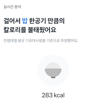 오늘 오전에 8000보쯤 걷고 들어왔더니 밥 한공기 칼로리를 불태웠다고 한다. 이렇게 연령대별 기초대사량 기준의 음식으로 표현해줘서 식단 조절하는데에도 도움이 되는 듯 하다.