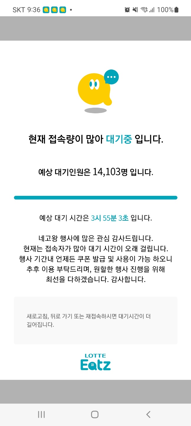 대기 인원에 얼마나 기다려야 하는지 막대바로 보여주고 실시간으로 숫자 줄어들게 하면서 돌아가기나 리프레시하면 더 늦어진다는 친절한 안내말까지 놓았으니 어쩔 수 있나, 기다려야지. 아니면 그냥 포기하고 다른 행사패키지를 주문하거나 먹고 싶은거 제값주고 잘 사먹든지.