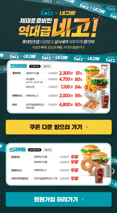 그래서 점심에는 그냥 햄버거를 사먹고 느긋하게 집에서 앱다운 받고 대기시간 대략 10분 정도 기다렸다가 들어가서 회원가입(간편가입 가능함)하고 네고왕 쿠폰 받으러 들어가서 새우버거랑 네고왕팩 다운받고 나니 조금 지나서 신규회원 무료 쿠폰들이 도착했다는 알림이 떴다.