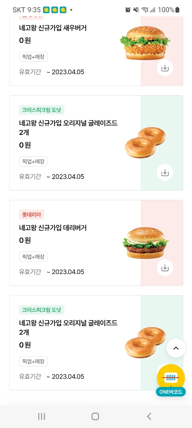 게다가 앱 신규 회원이라면, 새우버거, 데리버거 단품이 무료이며 엔제리너스와 크리스피크림도넛도 무료 쿠폰이 짜잔하고 생긴단다.