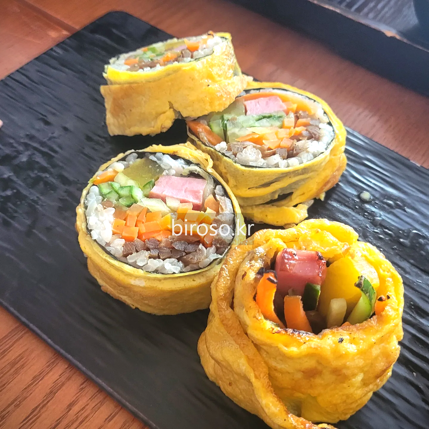 계란말이 김밥은 영양만점 대놓고 예쁘게 만들어봤수다 싶은 비주얼이다. 야채 넉넉히 들어가고 밥은 적어서 식단하는 분들이 좋아할것 같다. (햄빼고) 여기에 얼큰한 라면이 함께라면 한국인의 힘이 절로 나는 점심 메뉴 아니겠는가. 계란말이 김밥은 6000원. 계란말이 김밥보다 하드코어한 것을 원한다면 김밥전도 있으니 참고할 것.