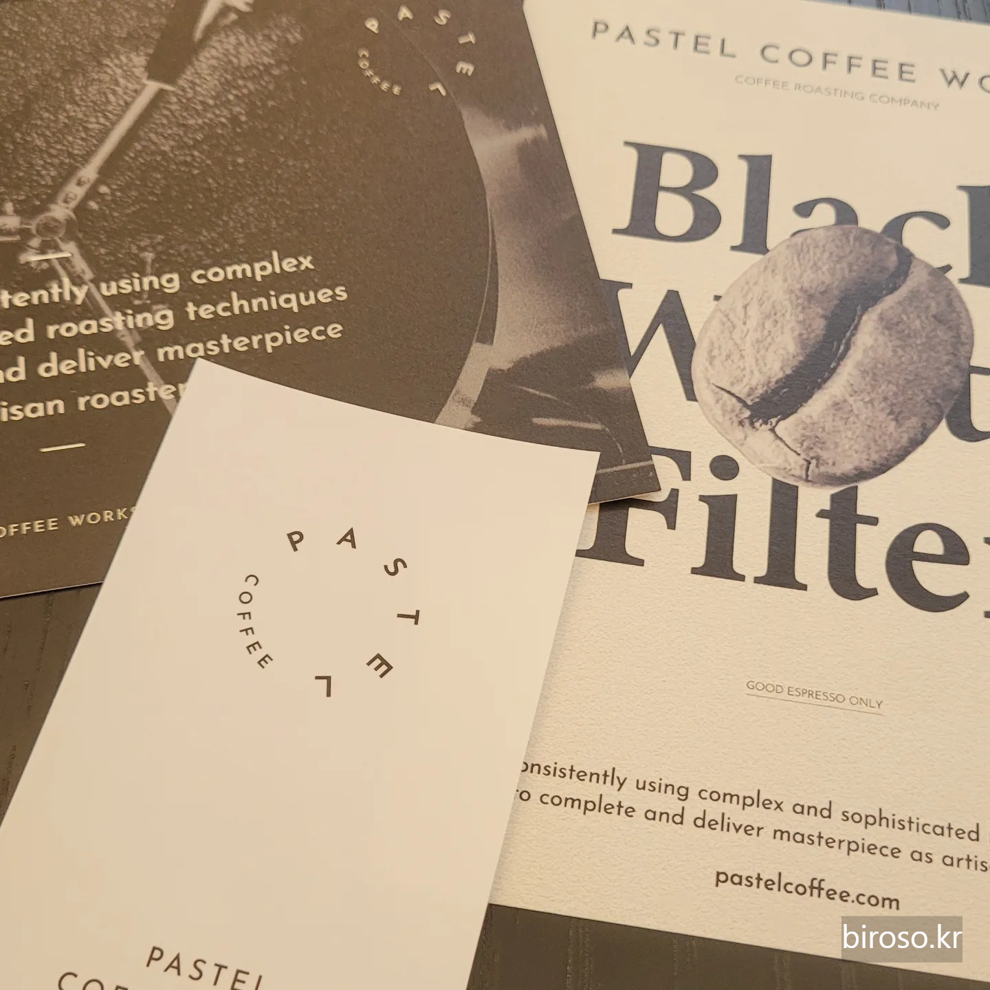 파스텔 커피 웍스 엽서와 스티커가 있다. 포장도 무심한듯 전문점 느낌이 들게 해준다.