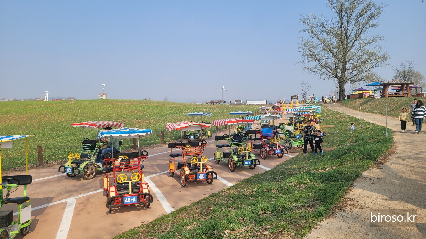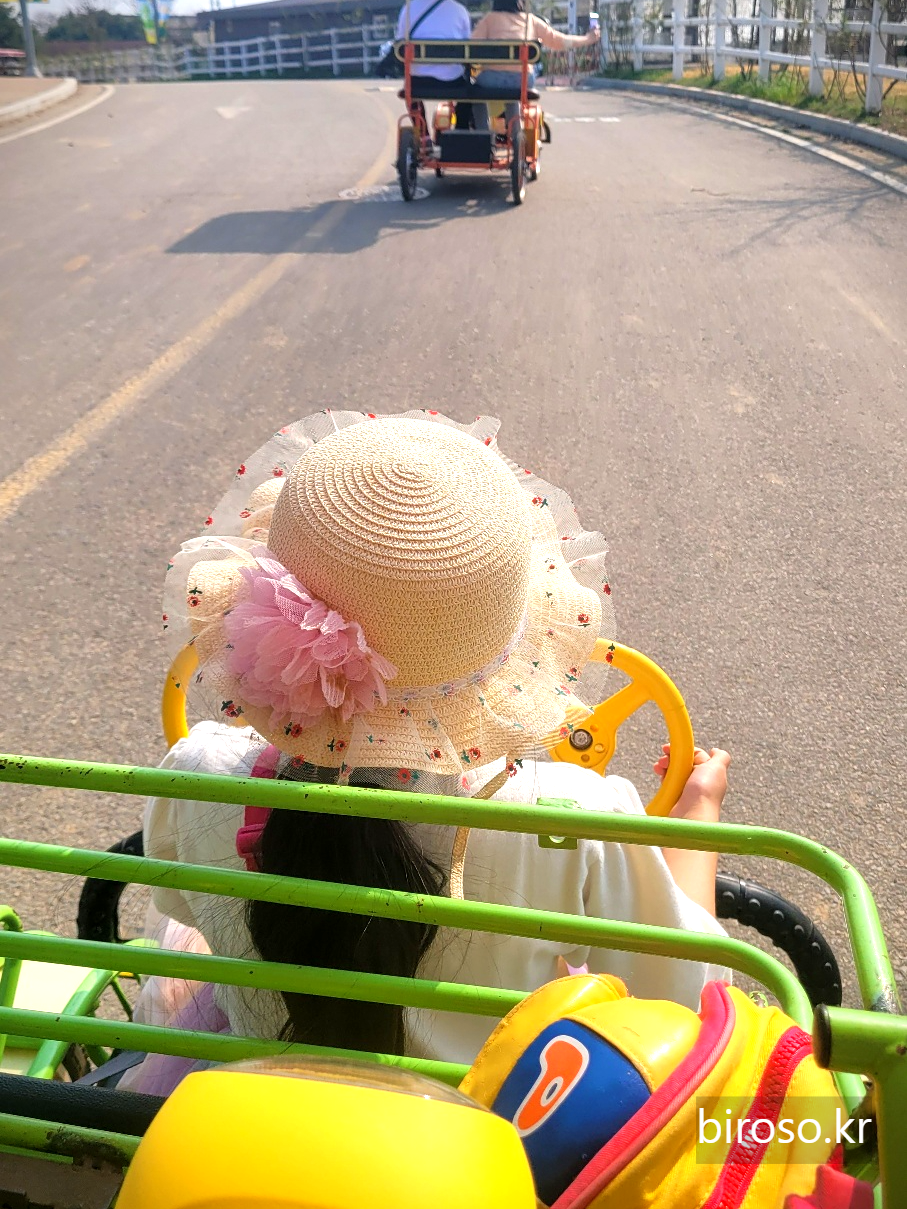 가장 추천하는 것은 바로 전동자전거다. 운전면허증이 있어야 대여가 가능한데 소형과 대형이 마련되어 있다. 초등학생 고학년 아이들을 둔 부모라면 대형을 빌려야 하고 유아 아이들 2명정도는 소형을 빌려서 탑승이 가능하다. 유아 아이들이 앞쪽에 앉도록 되어 있는데 앞쪽에 핸들모양이 있어서 맨 앞자리에서 핸들을 마음껏 돌려가며 직접 운전하는 흉내를 내면서 즐거워 한다. 전동 자전거는 팜랜드를 한바퀴 돌 도록 되어 있는데 30분 내에 돌아와야 한다. 10분 경과시 별도 요금 부과라고하는데 10분 내에서는 융통성있게 봐주는 것 같다. 사실 한바퀴 풀로 돌지 않고 중간에 내려서 초원을 내려다 보면서 잠깐 산책을 하거나 아이스크림을 하나 사먹게 되면 시간이 정말 순삭이기 때문이다.