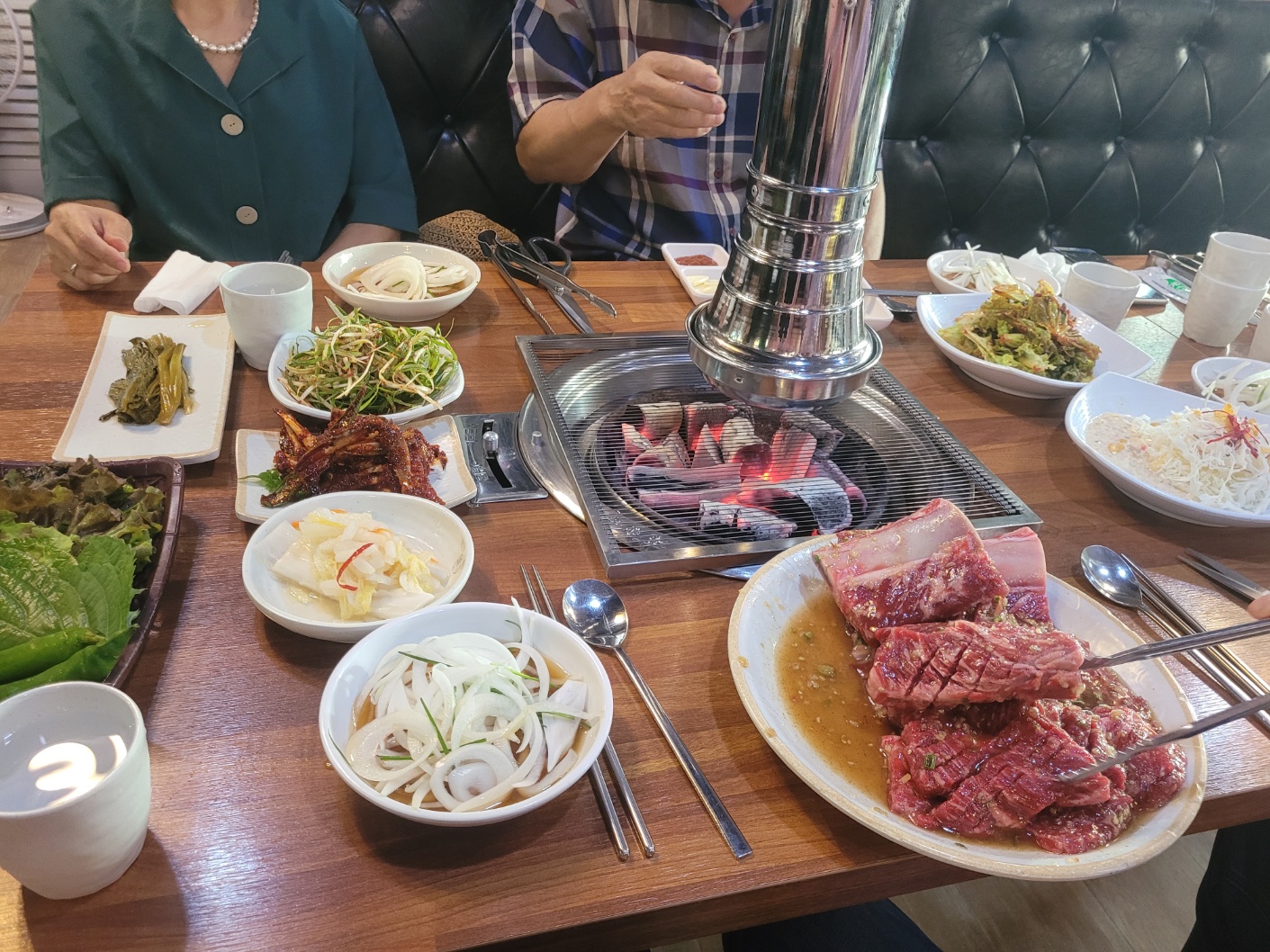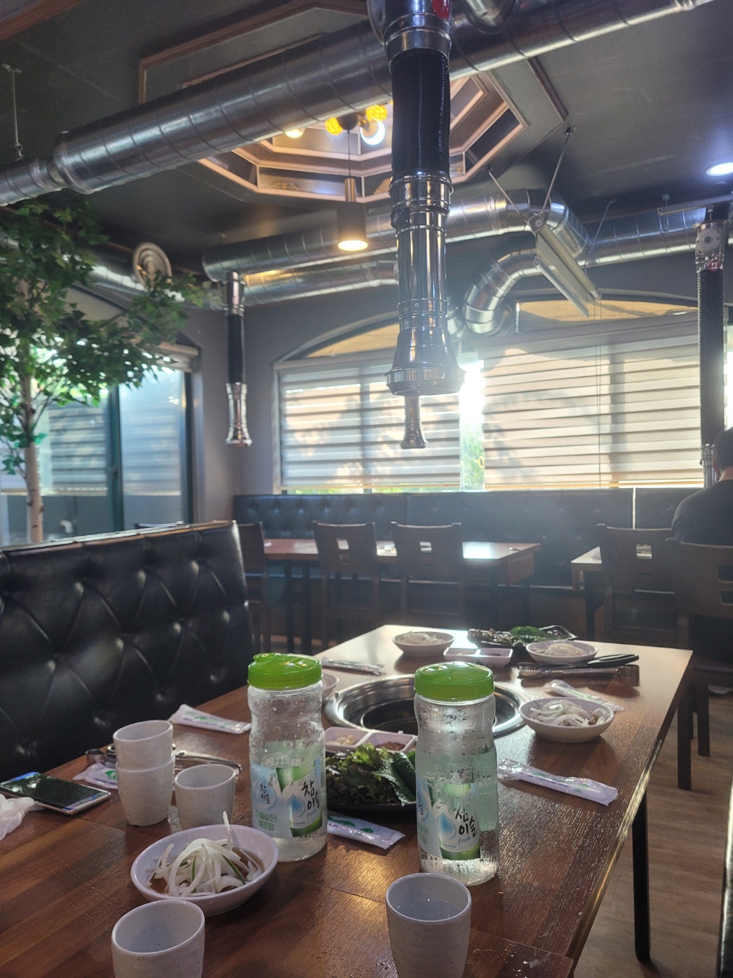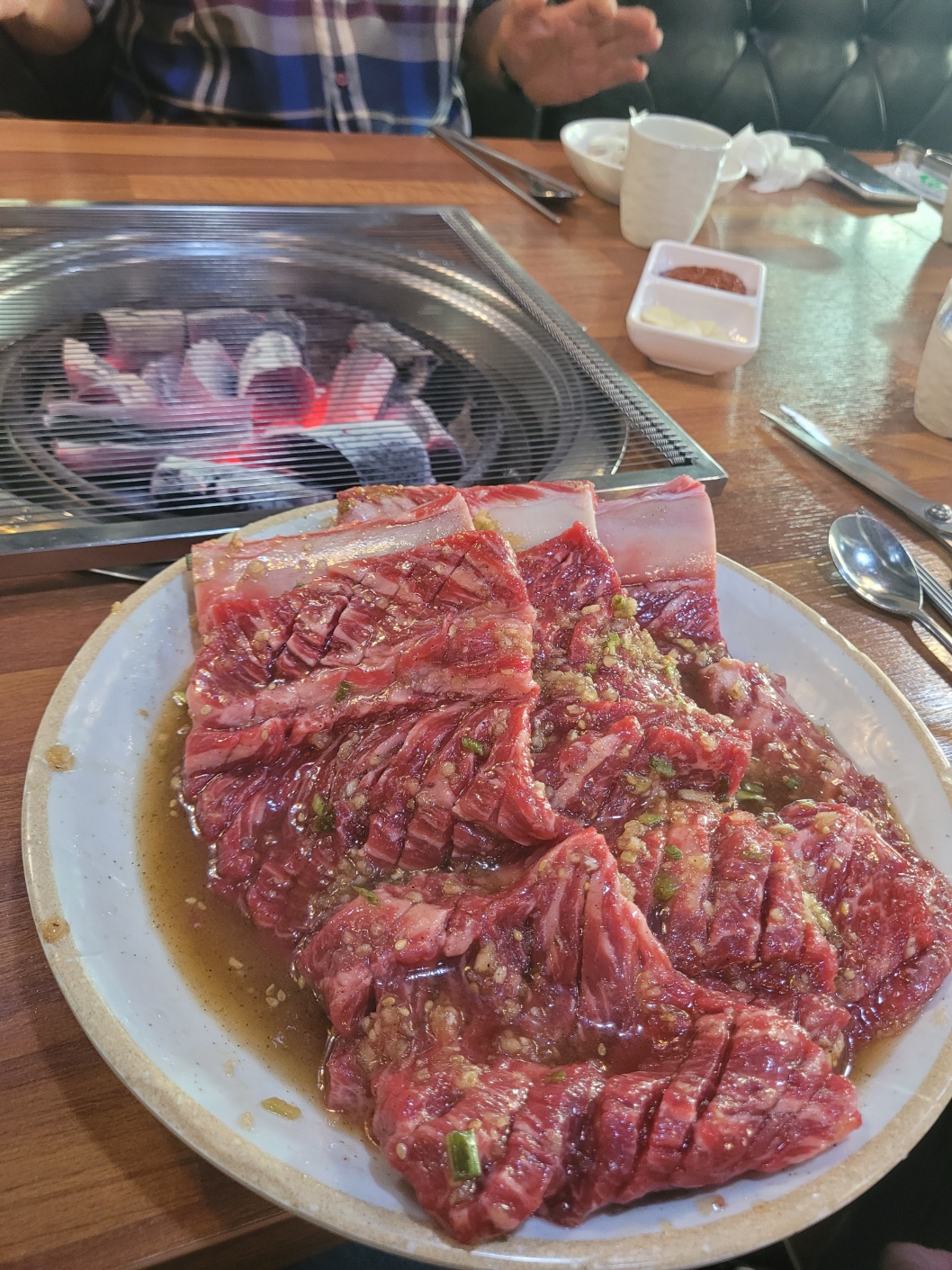 예약한 자리에 앉았는데 내부는 깔끔하고 일하시는 분들도 분주하면서도 싹싹하셨다. 마침 해가 기울어진 시간이라 햇살이 들어오는데 평일이라도 하루 일과 끝내놓고 맛있는 저녁 먹으러 온 사람들이라 그런지 표정들이 온화했다. 주문하고 숯불이 들어오는데 시꺼먼 숯이 아니라 불도 좋아보였다.