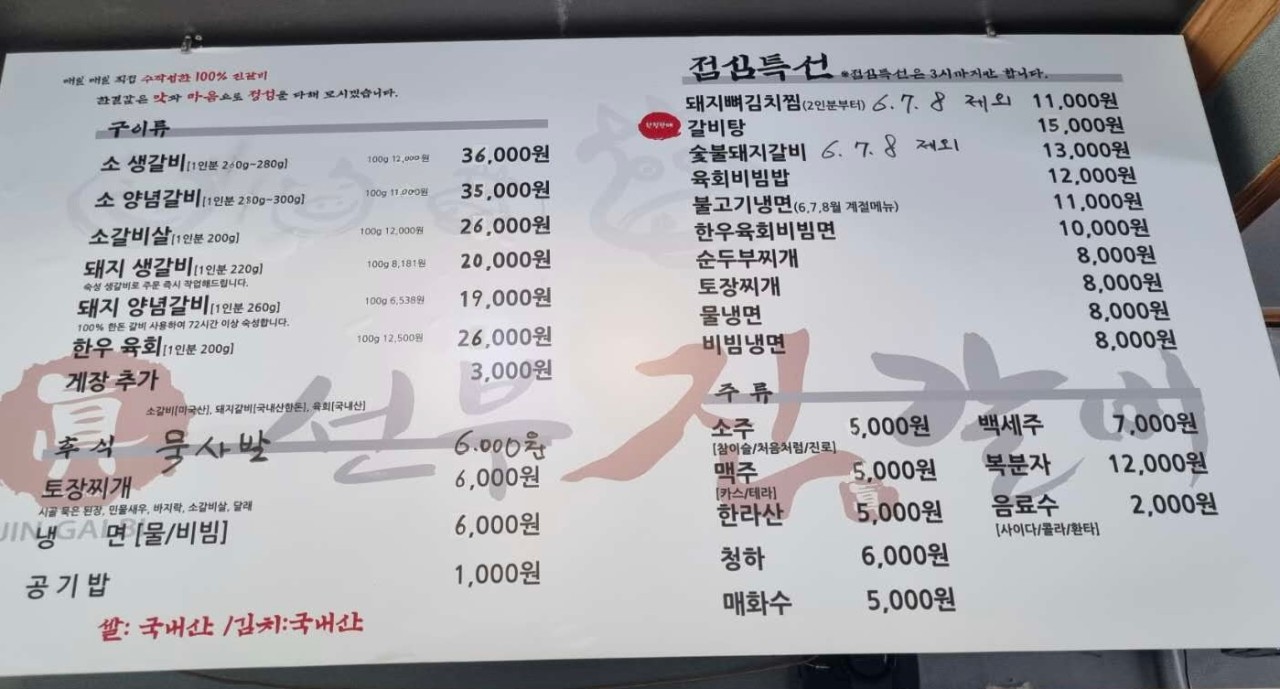 메뉴판은 이렇고 주변은 소갈비, 돼지갈비 다양하게 식사중이었다.