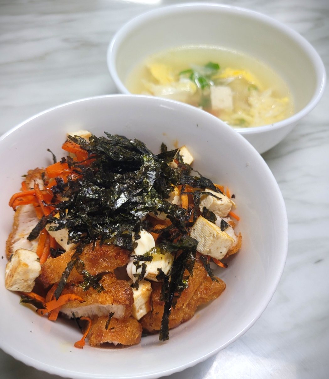 이번에는 당근 채 썬 것과 두부 조금 기름팬에 노릇하게 익혀주었다. 양배추 조금 채 썰어서 곁들이거나 해도 식감이 좋다. 없으면 아무것도 넣지 않아도 된다.