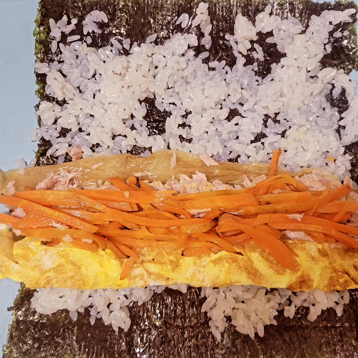 도마위에 김 거친면을 위로 해서 밥 반공기를 넓게 펼쳐서 깔고 그 위에 묵은지를 펼쳐 얹은 다음 참치 1/4분량을 올린다. 밥과 접촉 면적을 적게 하는게 좋다. 그리고 그 옆에는 달걀, 위에는 당근으로 철통 방어를 한 다음, 끝쪽을 검지와 엄지사이로 잡고 나머지 손가락으로 재료를 감싸 안으로 밀어 넣는 느낌으로 쥔다음 재료 위로 김을 한바퀴 돌리며 얹으며 적당한 힘을 주어 눌러준다. 아직 검지와 엄지 사이에 놓치지 않은 김 끝쪽은 재료를 감싸 앉으며 안착하는 동시에 나머지 손가락은 김밥 위를 가볍게 감싸쥐며 원통 모양이 되게 모양을 가다듬으면서 쥐고 나머지 김밥을 반바퀴 더 돌려 감싸서 마감 부분이 아래로 향하도록 하여 원통 중심 방향으로 골고루 움켜쥐듯 눌러준다.