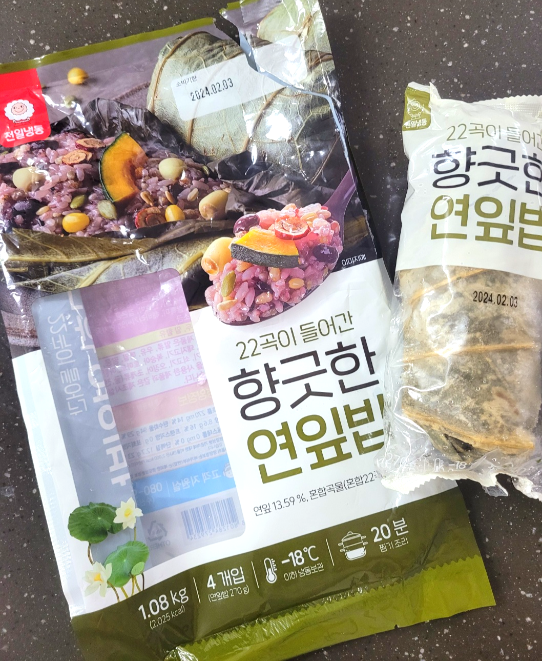 연잎밥은 트레이더스에서 냉동된 '향긋한 연잎밥'을 사두었던 것을 꺼냈다. 포장에 개별 포장된 4개 연잎밥이 들었고 13-4000원 선이었다. 단호박 조각에 은행 22곡으로 지어진 잡곡밥이 연잎에 쌓여 쪄내면 향긋한 냄새가 기분좋게 만든다.