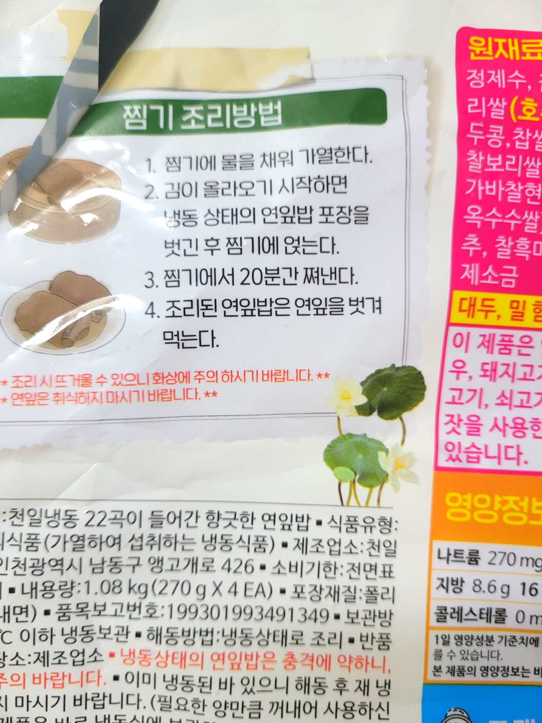 개당 270g으로 조금 많은편이다. 칼로리는 양도 많고 찰밥이라 500칼로리정도다. 잡곡과 콩이 들어있어서 단백질이 12.7g들어있고 당류는 1g 미만이라 건강한 비율로 영양이 골고루 들었다. 찰기가 있고 양이 많아서 반찬 많이 차리고 채소를 곁들여 먹을 생각으로 한 개를 반으로 나누어 먹는게 좋았다.