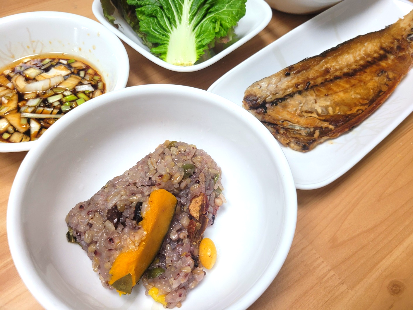 전자레인지로 연잎밥을 찌는 동안 쌈장처럼 먹을 두부에 갖은 야채를 볶아내고, 고등어를 기름종이 덮어 얌전히 구웠다. 혹시 몰라 양념간장도 만들었다. 나중에 아이 주문으로 계란찜도 휘리릭 만들어 곁들였다. 대략 15분 - 20분 걸렸다.