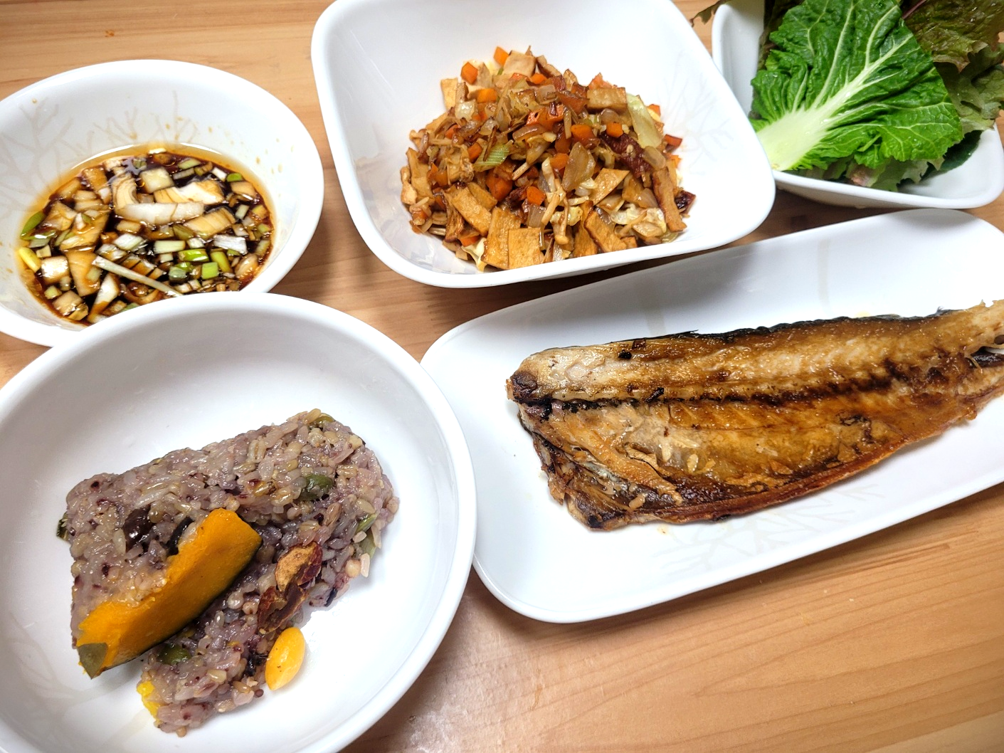 전자레인지로 연잎밥을 찌는 동안 쌈장처럼 먹을 두부에 갖은 야채를 볶아내고, 고등어를 기름종이 덮어 얌전히 구웠다. 혹시 몰라 양념간장도 만들었다. 나중에 아이 주문으로 계란찜도 휘리릭 만들어 곁들였다. 대략 15분 - 20분 걸렸다.