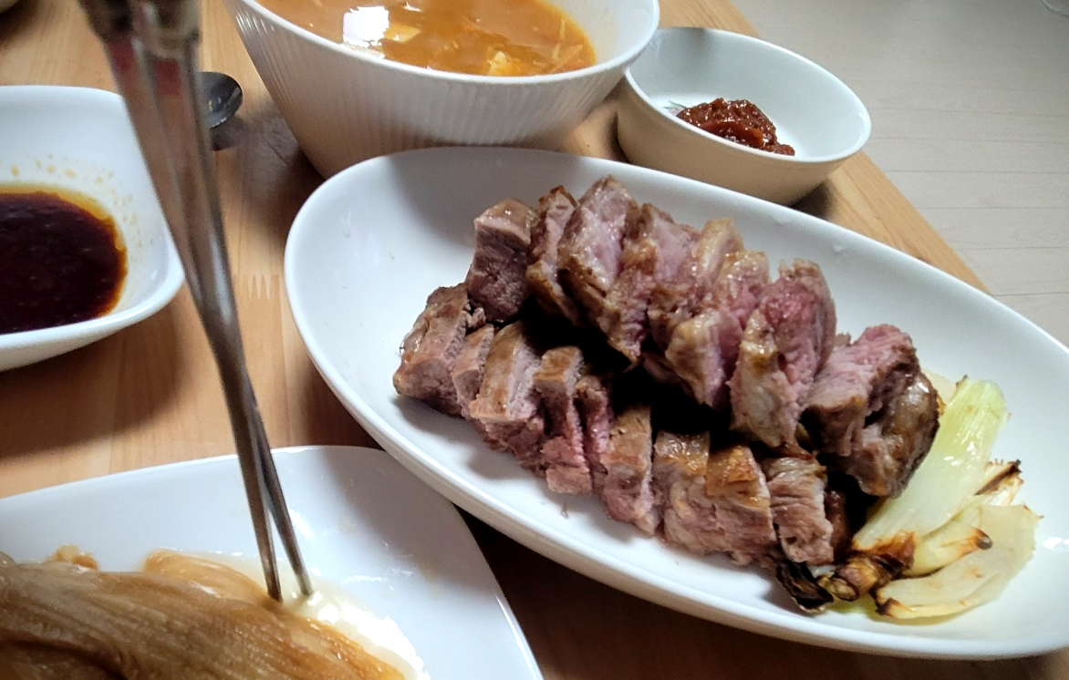 뜨거워서 썰 때 좀 두툼하게 썰었더니 몇 개는 젓가락으로 찢어서 먹는데 잘 찢어지고 나름 지방 부분도 있어서 고소하고 맛이 있었다. 나중에는 파, 양파를 더 많이 넣어서 곁들이기 좋게 해볼 생각이다.