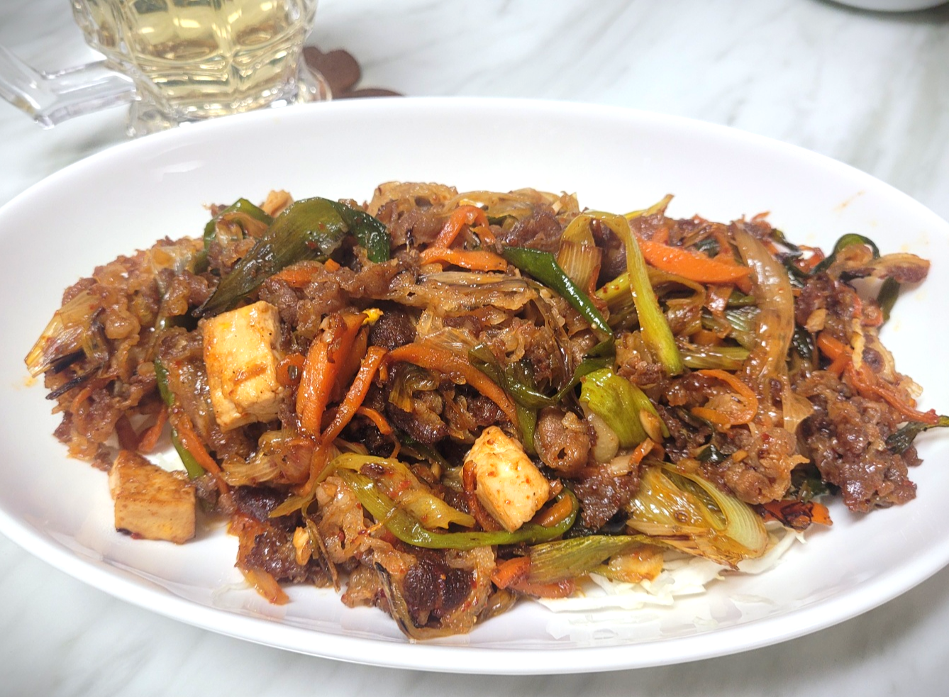 재료(2인분 기준): 우삼겹 100-200g, 대파 2 대, 당근 조금, 두부(생략가능), 마늘 1T, 굴소스 2T, 진간장 1T, 설탕1T, 고추가루2/3T, 참기름 조금, 후추 조금, 맛술 1T