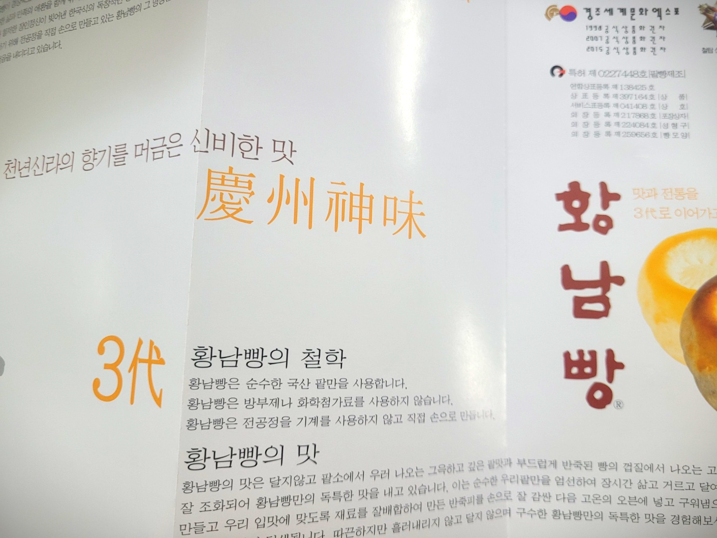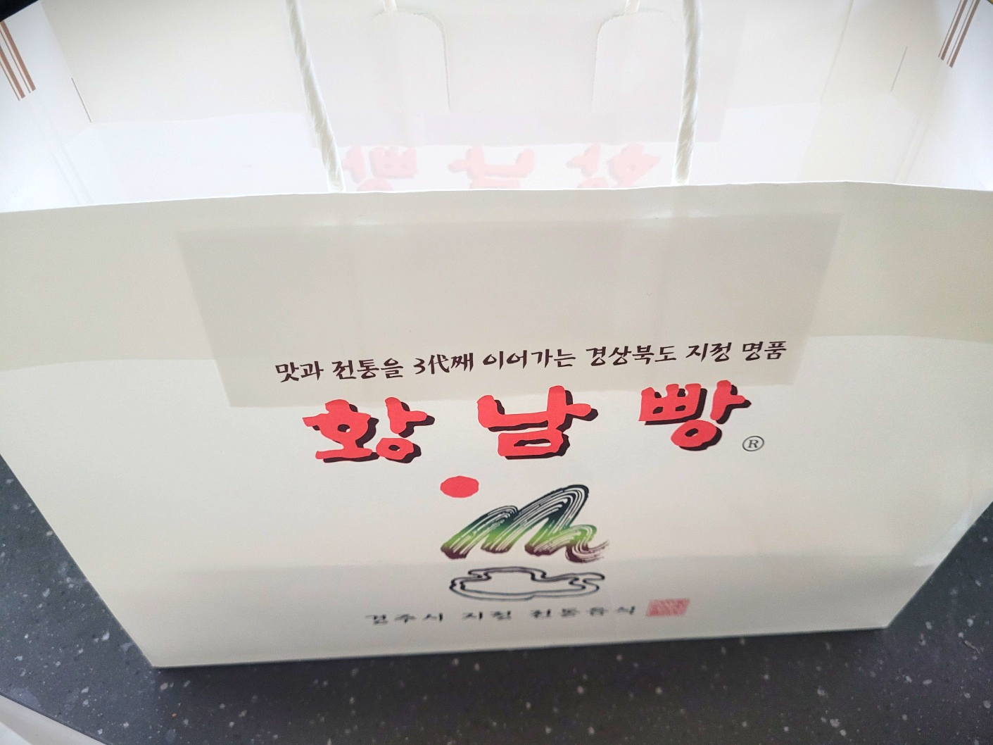 황남빵을 구매하면 경주시에서 지정한 전통음식이라고 적힌 쇼핑백에 상자에 담긴 황남빵 박스와 리플렛을 넣어준다. 황남빵로고와 함께 맛과 전통을 3대째 이어가는 경상북도 지정 명품이라는 문구가 눈에 들어온다.